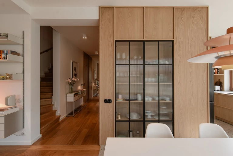 Na parterze główną rolę grają dębowe panele, poprowadzone od podłogi aż po sufit i nadające wizualny rytm przestrzeni. Architekci ukryli w drewnianej zabudowie zarówno drzwi, jak i fronty schowków, tworząc spokojny, płynny ciąg od holu przez część dzienną po kuchnię. Drewniany moduł został przełamany ryflowanym szkłem, które zdobi fronty wbudowanego kredensu.
