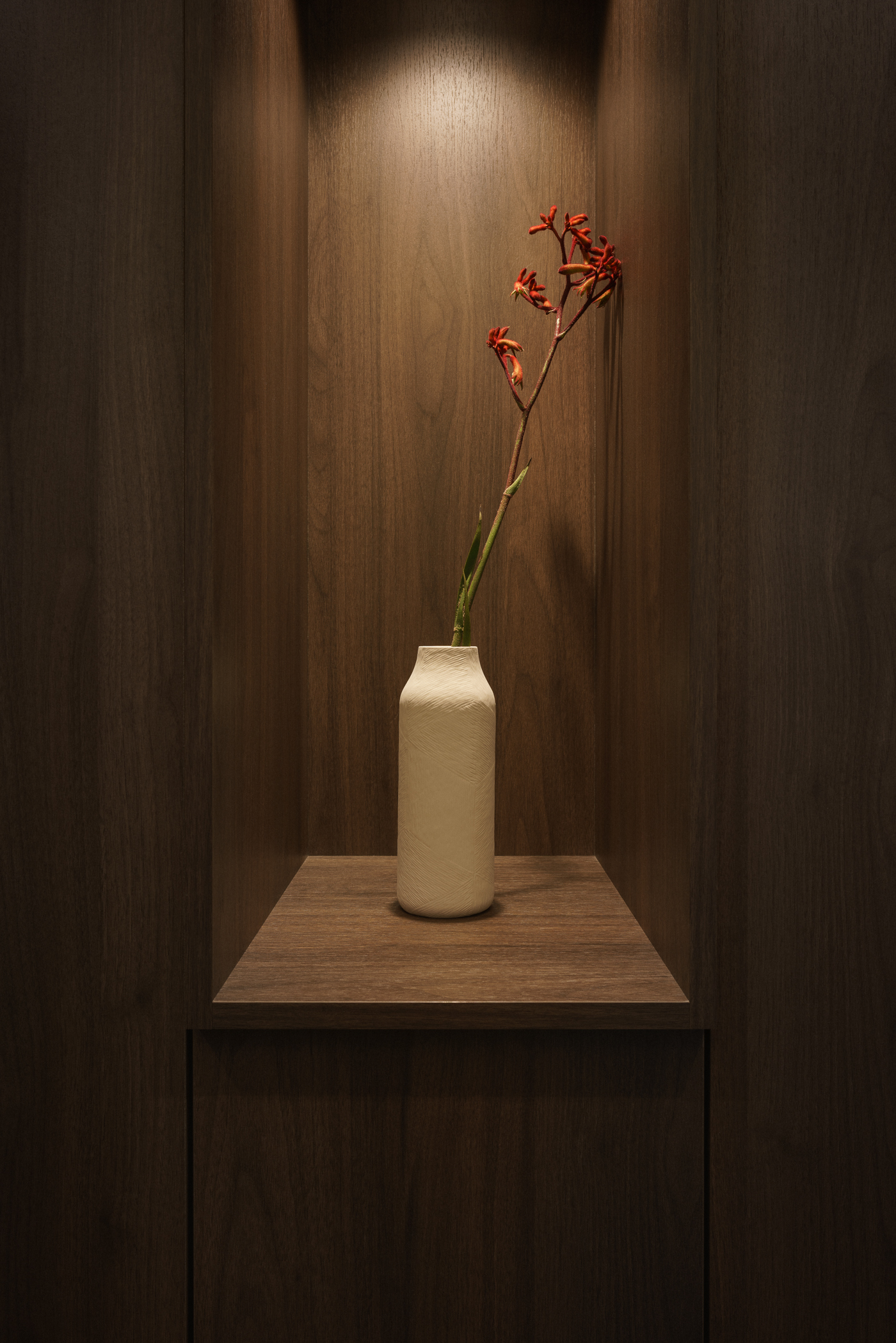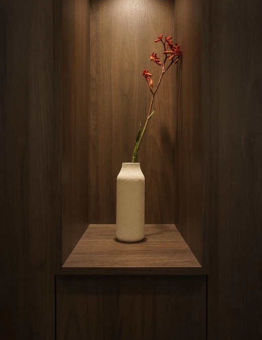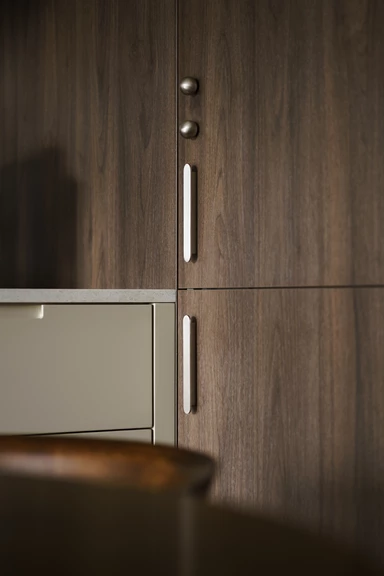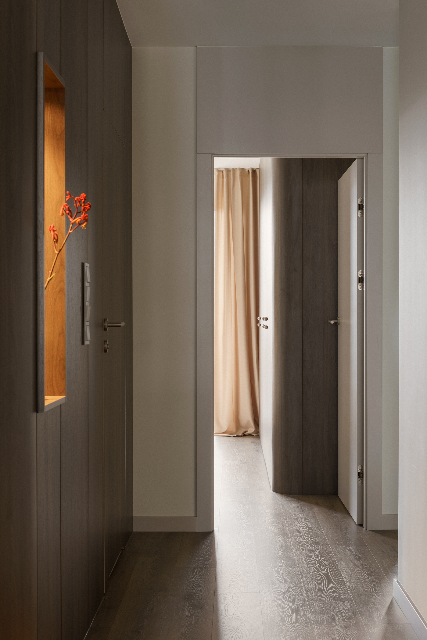 Już w holu pojawia się jeden z najważniejszych motywów tego projektu – zabudowa stolarska w głębokim odcieniu drewna, w której ukryto drzwi i szafy. Dzięki temu przestrzeń pozostaje wizualnie spokojna i uporządkowana. W strukturze zabudowy znalazła się także podświetlona nisza, która subtelnie zmienia odbiór całości.