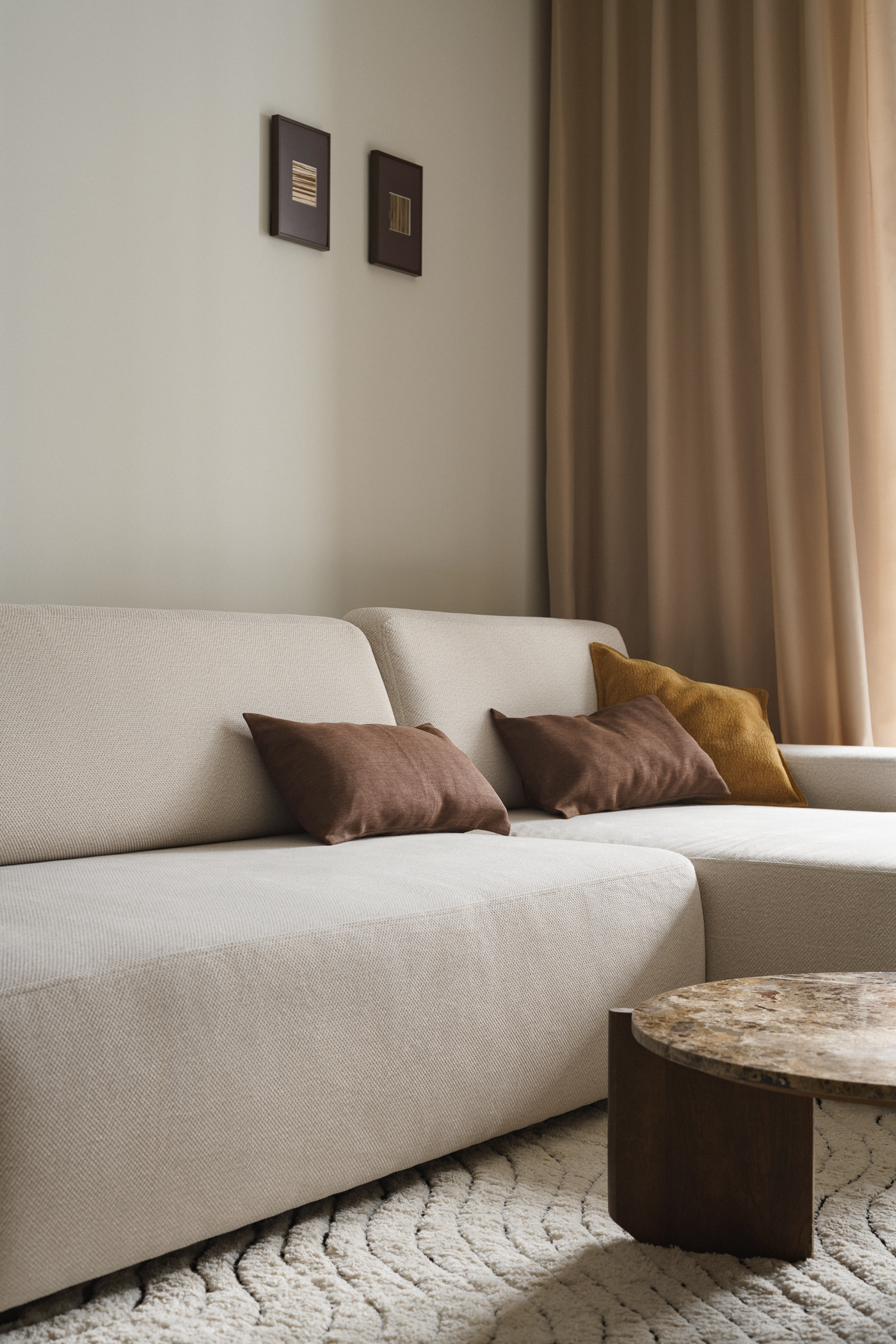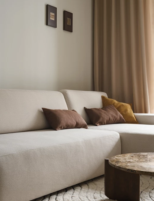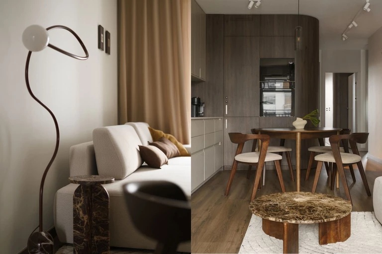 Kremowe ściany, jasne powierzchnie i miękkie tkaniny Sandra Tomaszewska z sato studio zestawiła z wyraźnym, ciemnym drewnem. Ten kontrast prowadzi przez kolejne strefy 60-metrowego mieszkania zlokalizowanego na poznańskich Jeżycach.