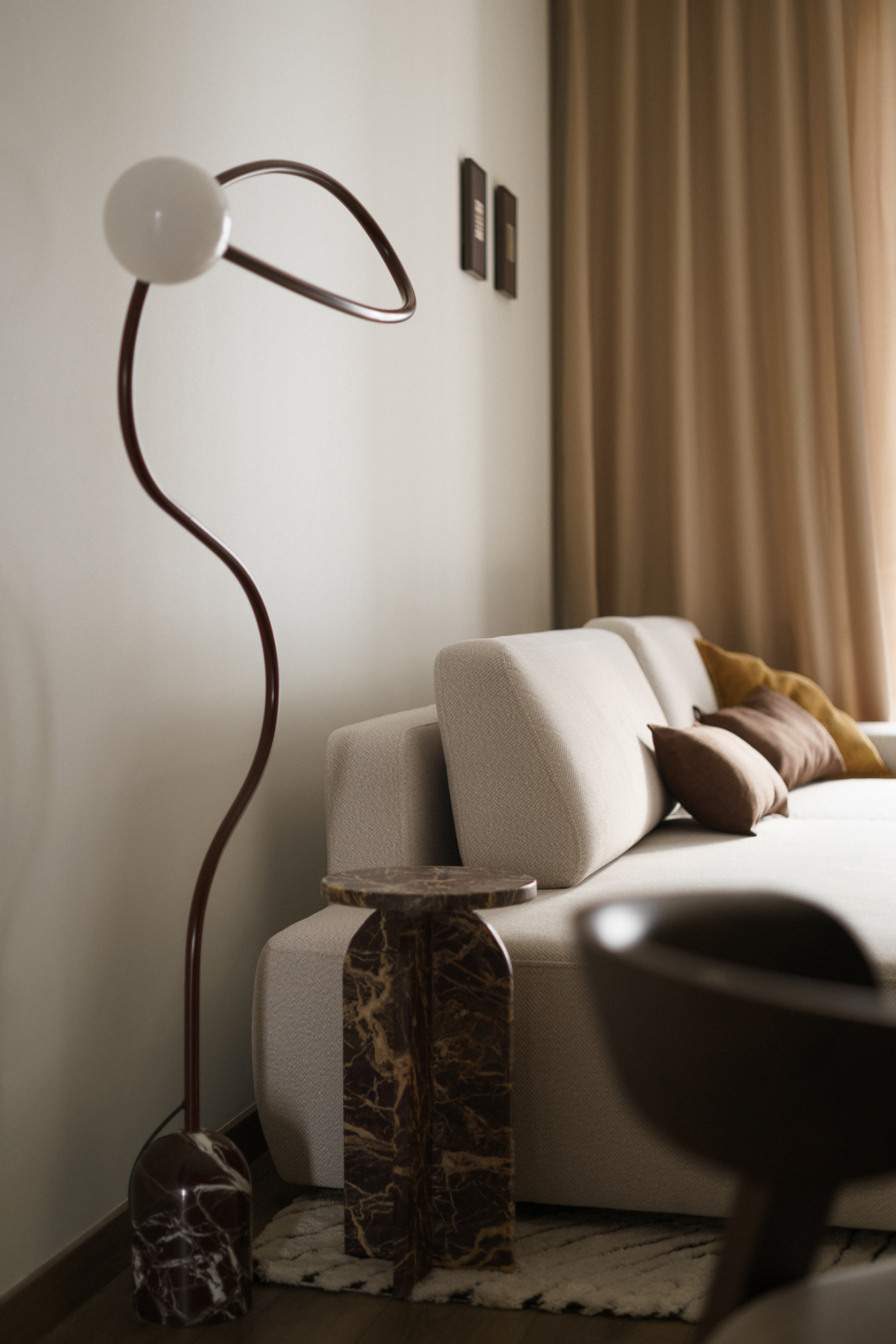 W części wypoczynkowej pojawia się sofa oraz niskie stoliki z kamiennymi blatami. Kamień wprowadza dodatkową fakturę i wizualny ciężar, który kontrastuje z lekkimi formami oświetlenia. Duże okna wpuszczają dużo naturalnego światła, które podkreśla strukturę drewna i kamienia, a wieczorem klimat przestrzeni buduje punktowe oświetlenie: dyskretne lampy, podświetlenia i delikatne reflektory.