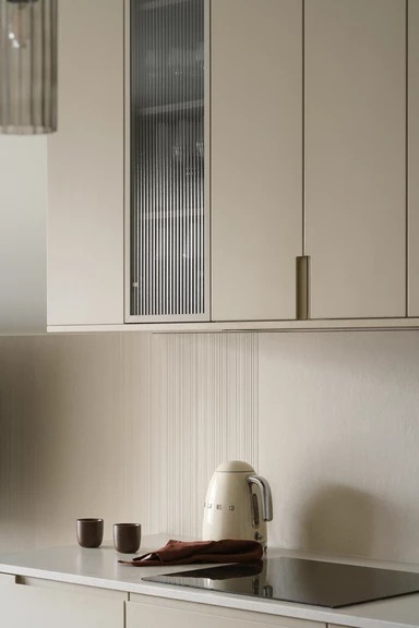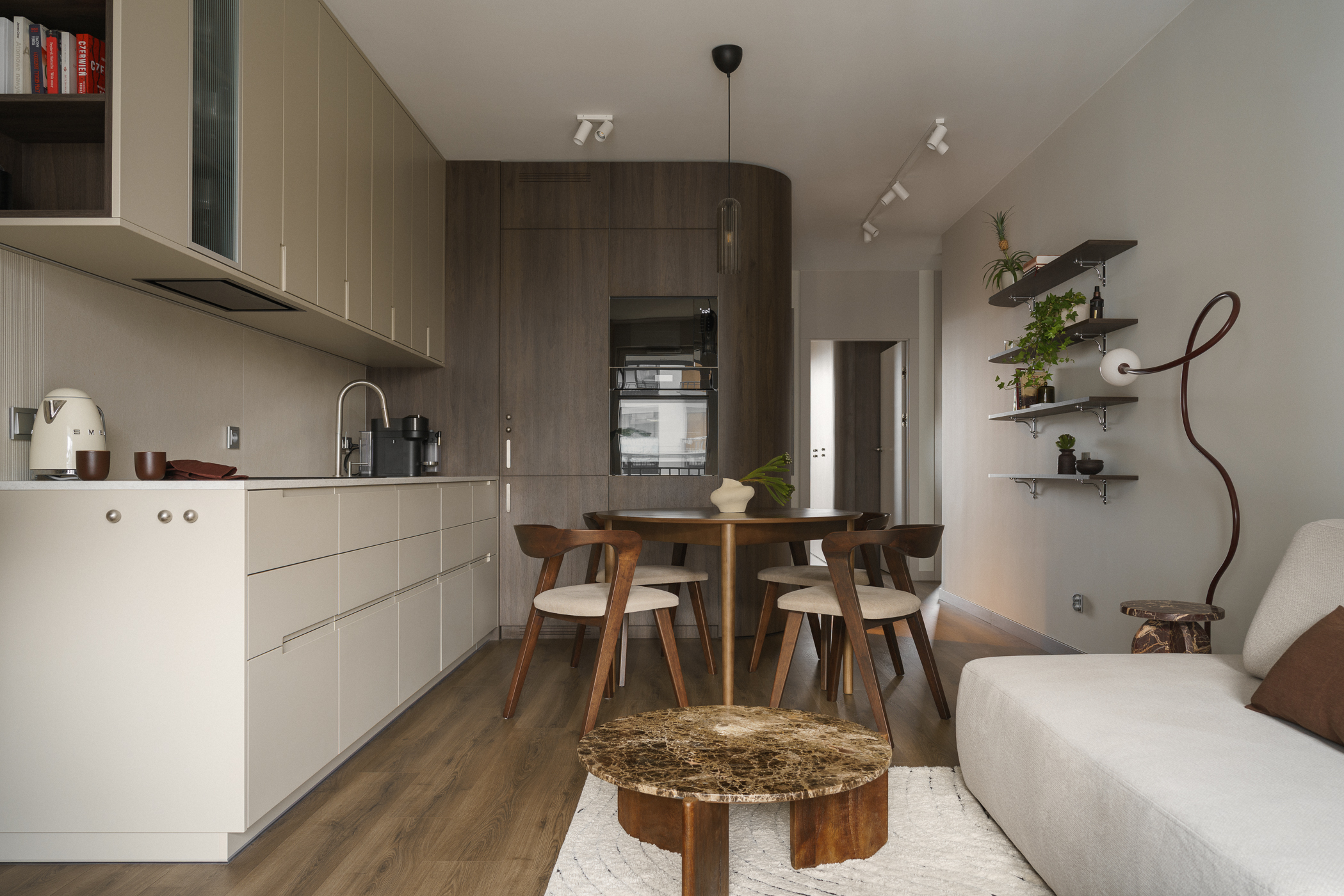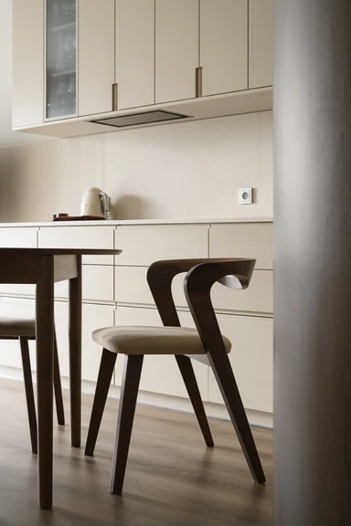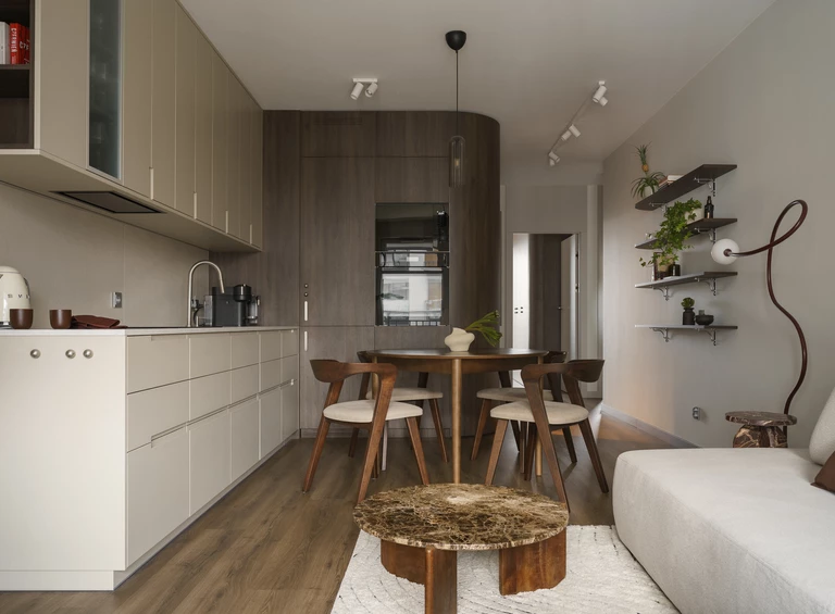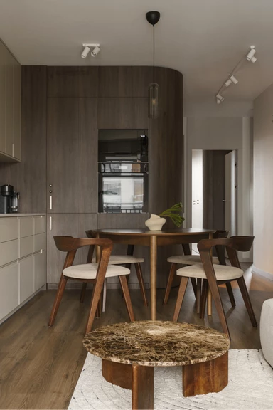 Strefa dzienna to jedna, płynna przestrzeń. Kuchnia utrzymana jest w jasnych, neutralnych tonach. Proste fronty, zlicowane uchwyty i delikatna ryflowana faktura ściany tworzą uporządkowane tło dla okrągłego stołu z ciemnego drewna, wokół którego ustawiono krzesła o miękko wyprofilowanych oparciach.