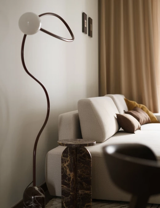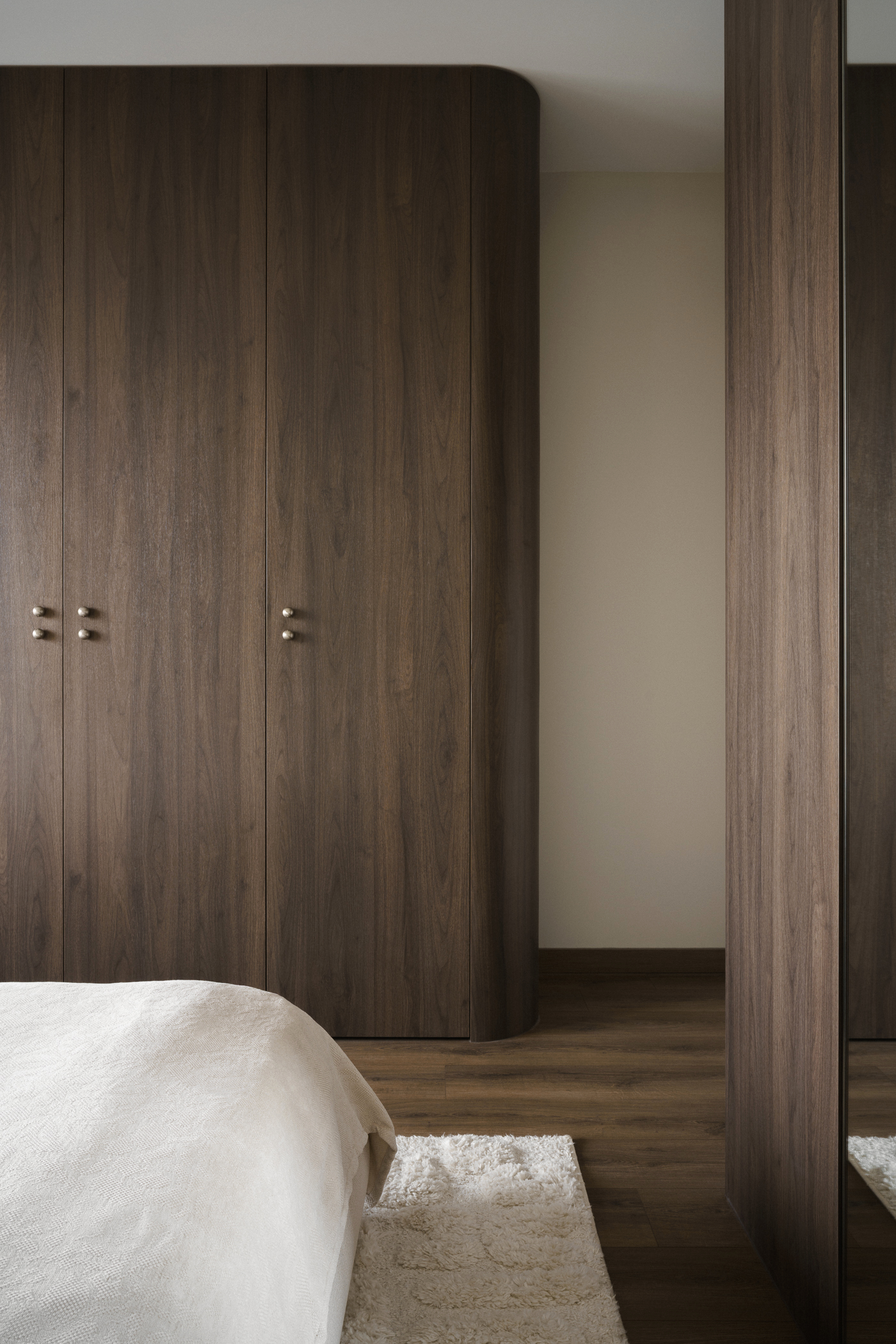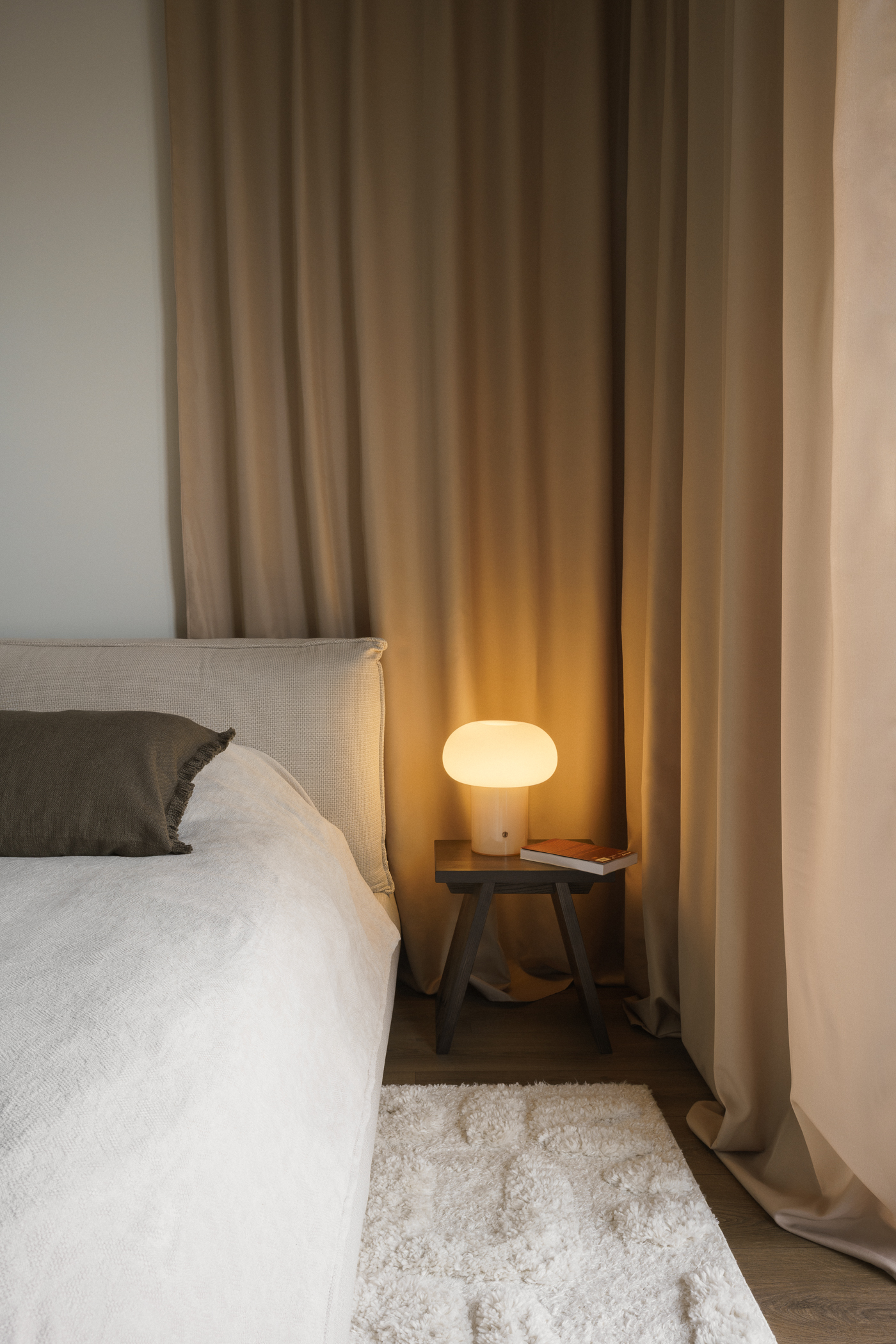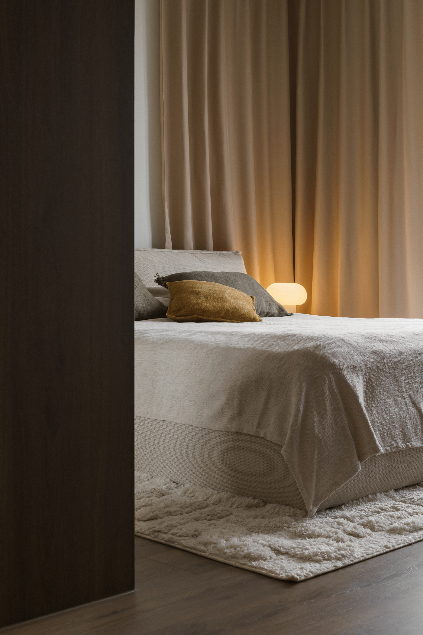 Sypialnia utrzymana jest w tej samej, stonowanej estetyce. Miękkie tkaniny, ciepłe światło i obecność ciemnego drewna mają tu stworzyć przede wszystkim miejsce do odpoczynku i regeneracji.