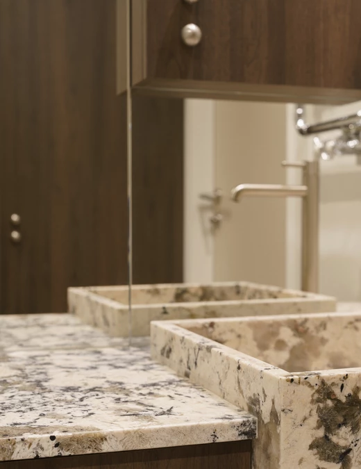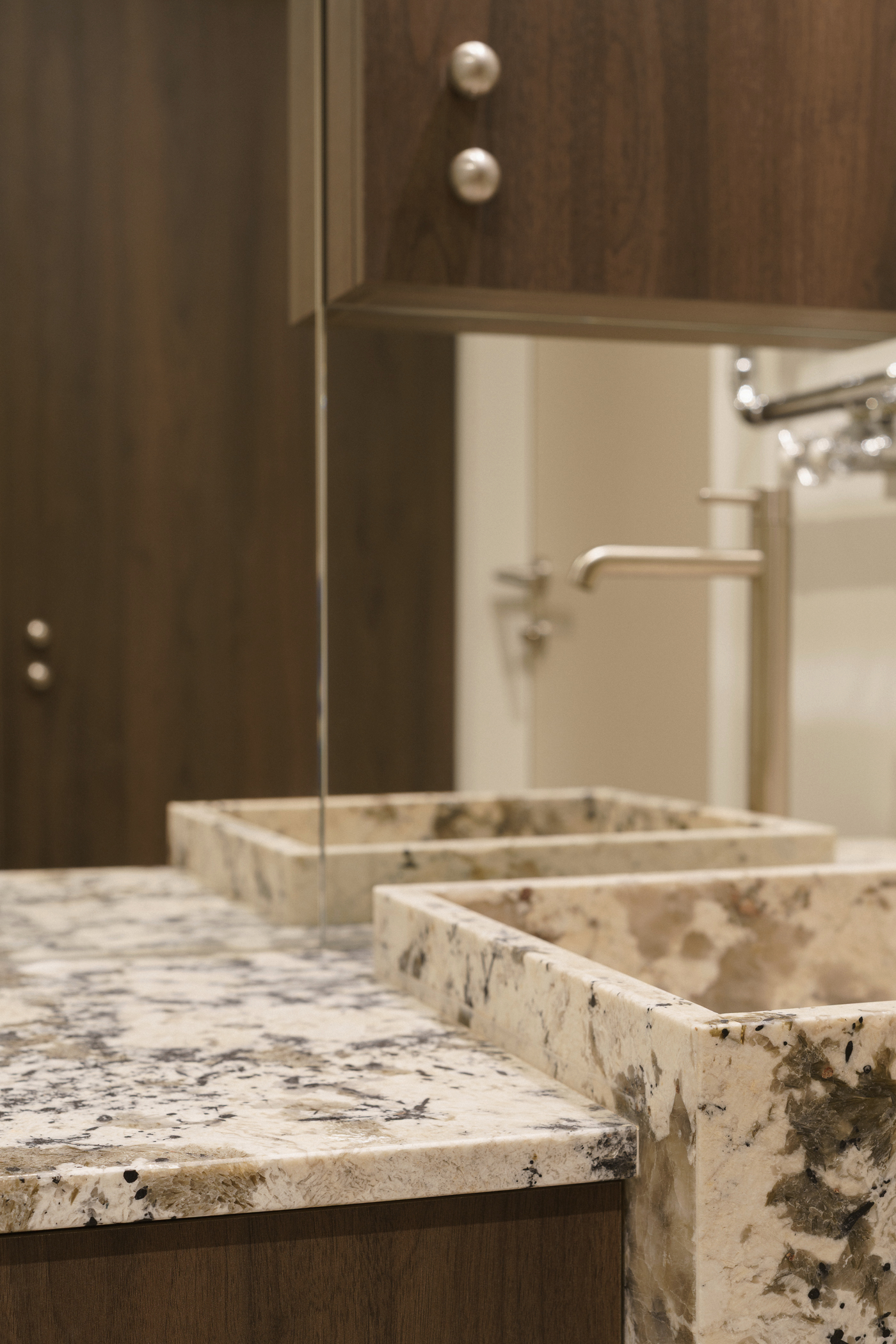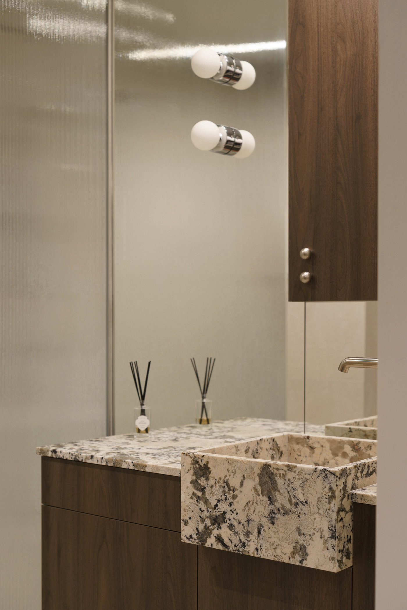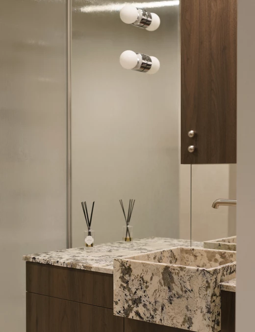 W łazience pojawia się mocniejszy akcent materiałowy, jakim jest kamienna umywalka wykonana na wymiar i zintegrowana z blatem. Jej wyraźny rysunek zestawiono z ciemną zabudową i jasnymi płytkami, co tworzy czytelną, ale minimalistyczną kompozycję.