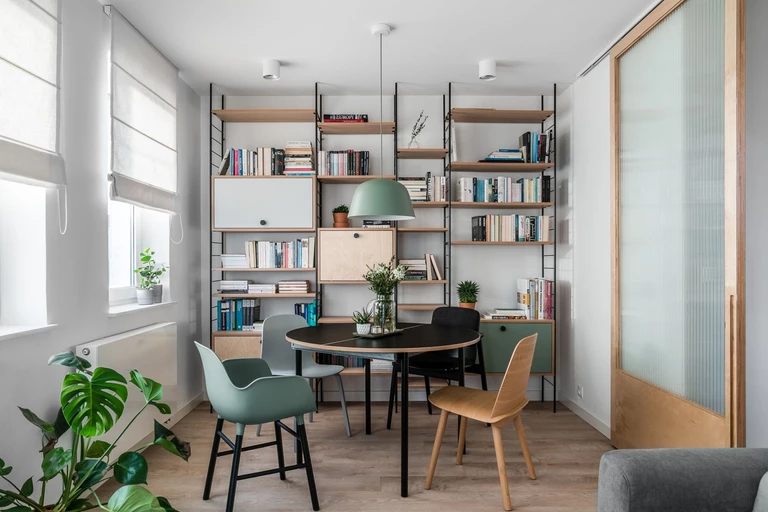 Mieszkanie zaprojektowano w stylu skandynawskim w nowoczesnym wydaniu. Naturalna brzozowa sklejka, w połączeniu z pastelowym seledynowym odcieniem zieleni, stanowi element powtarzający się w każdym pomieszczeniu. Tłem dla tego zestawienia jest biel i jasna szarość. Dla kontrastu zdecydowano się na wprowadzenie czarnych elementów w konstrukcji mebli i dodatkach. Większość mebli wykonano na zamówienie u stolarza, dzięki czemu zabudowy są spójne materiałowo i kolorystycznie. Dodatki i meble ruchome pochodzą ze sprawdzonych skandynawskich marek Muuto, Hay, i Normann Copenhagen.
