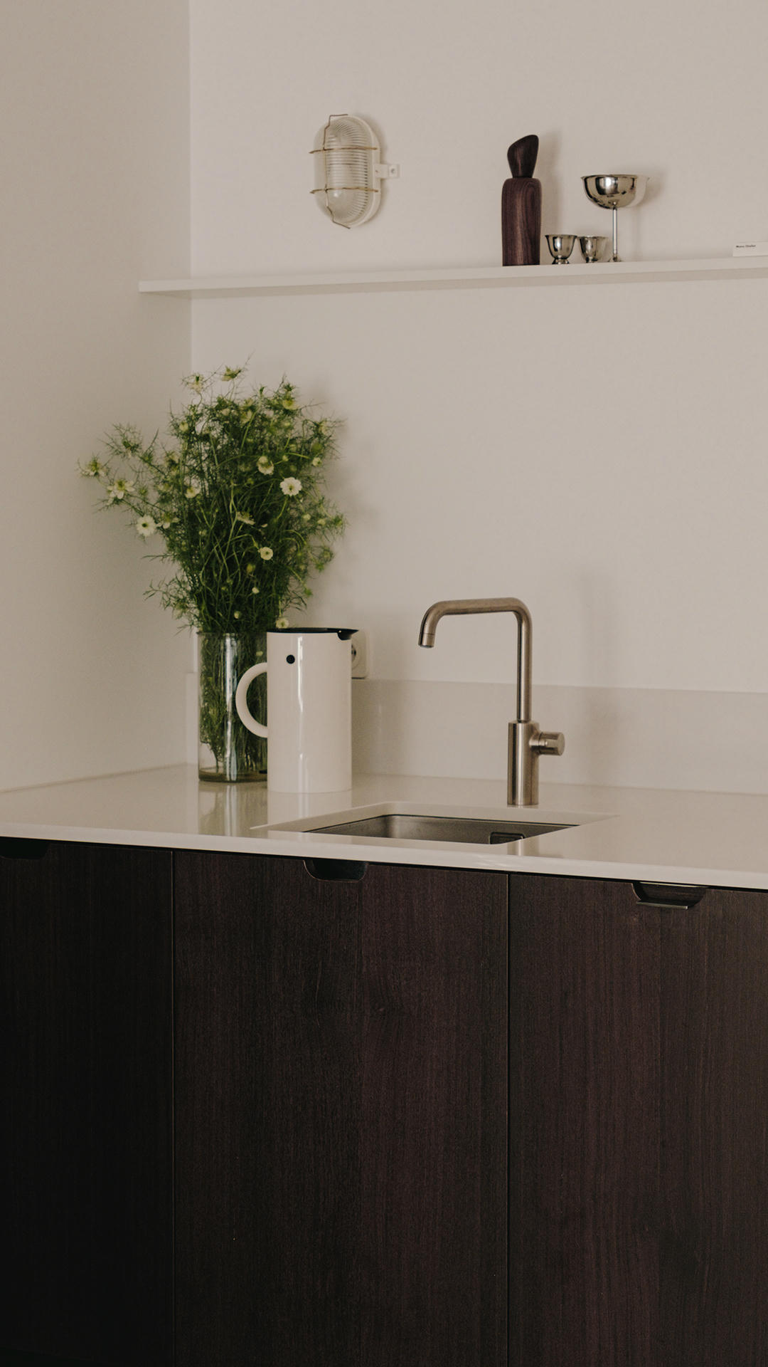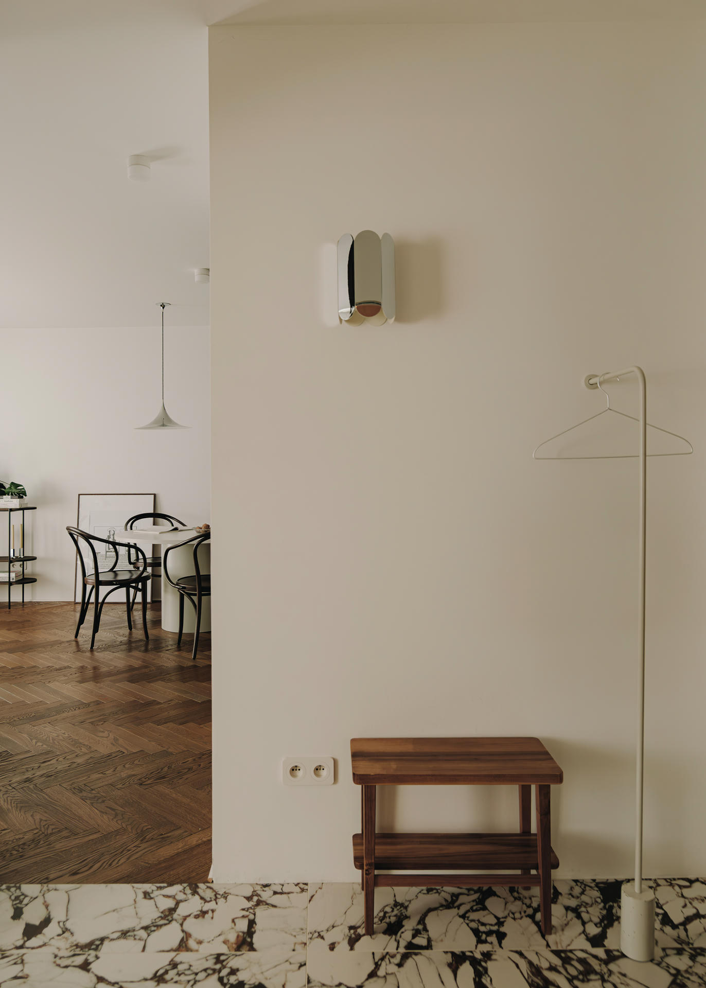 Z kolei korytarz potraktowano jako jasne, minimalistyczne przedłużenie części dziennej. Zaprojektowana zabudowa zapewnia miejsce na obuwie tuż przy wejściu, a stalowe wieszaki przeznaczono na odzież wierzchnią gości. Ciepły akcent dodaje podłoga z płytek Pulp Red marki 41zero42, natomiast ścianę zdobi wyrazisty, srebrno-lustrzany kinkiet marki Hay.