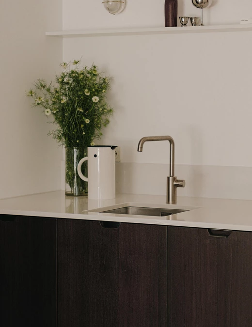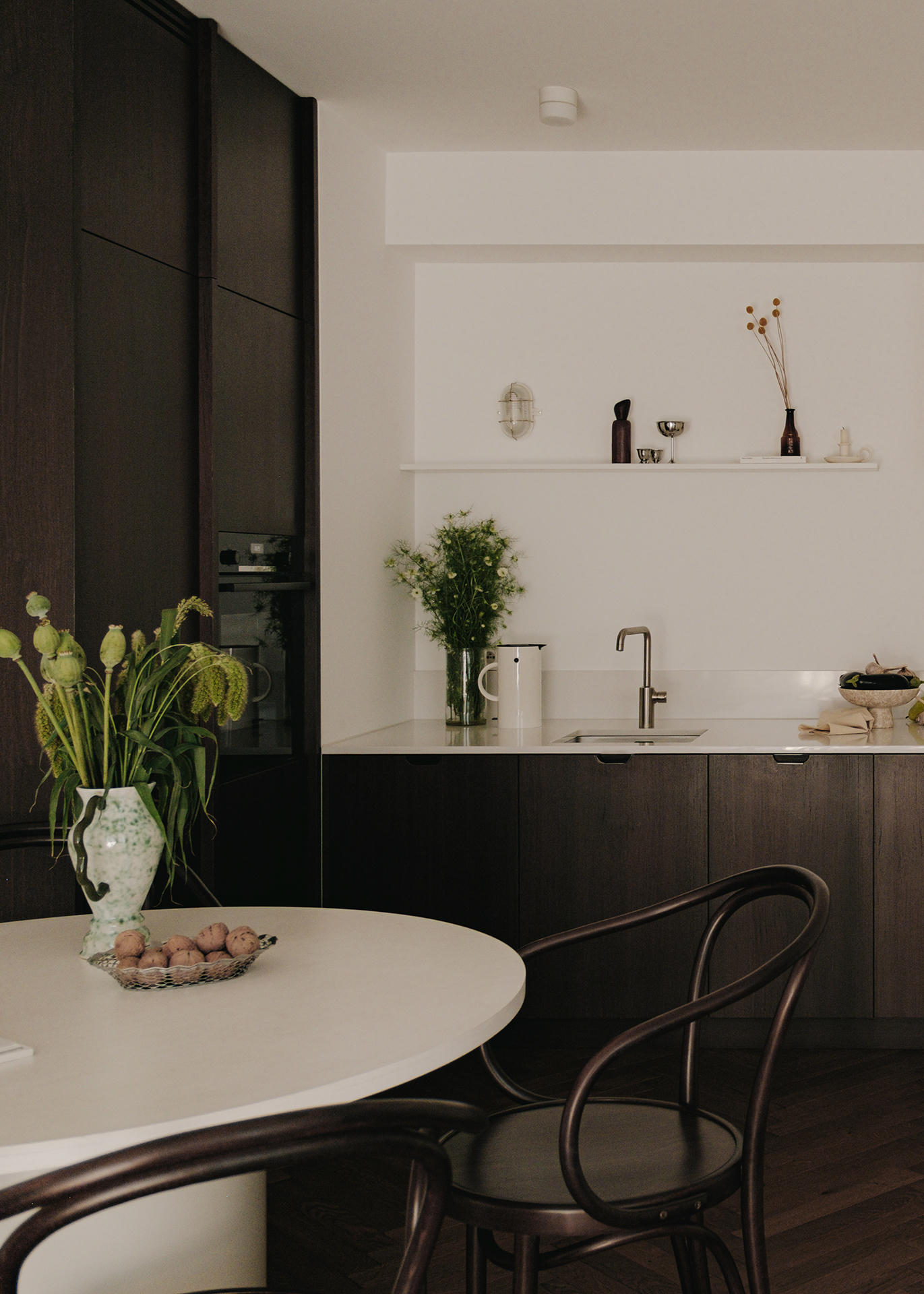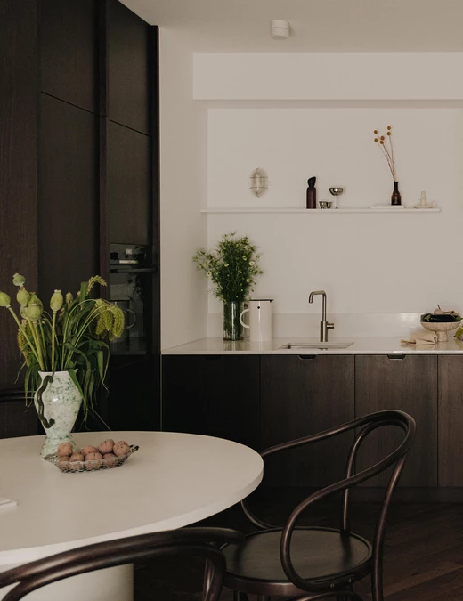 Kuchnia zachowuje nowoczesny i uporządkowany charakter. Rezygnacja z górnych szafek optycznie otworzyła wnętrze, a zwiększona do 80 cm głębokość blatów zapewniła znacznie więcej miejsca do pracy oraz zrekompensowała utraconą przestrzeń do przechowywania. Wysoka zabudowa po lewej stronie, wykończona ciemnobrązowym fornirem i wyposażona w pionowe uchwyty na całej wysokości frontów, nawiązuje stylistycznie do mebli w salonie i buduje wizualną klamrę.