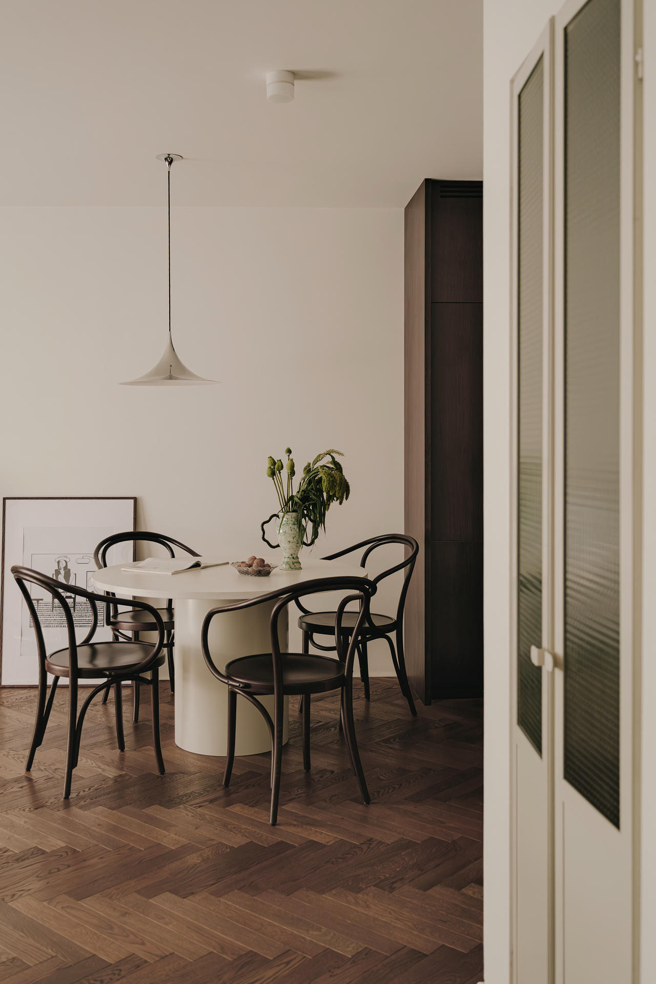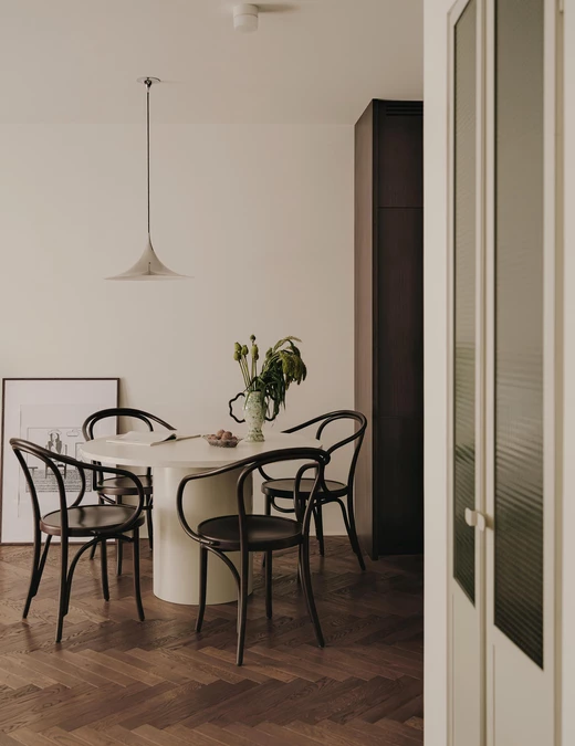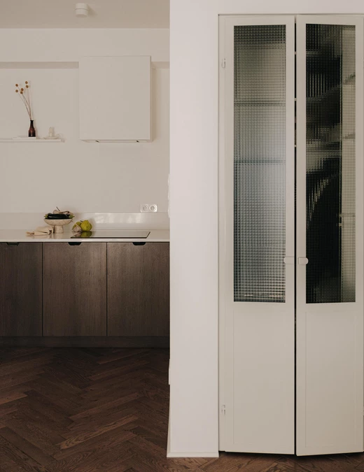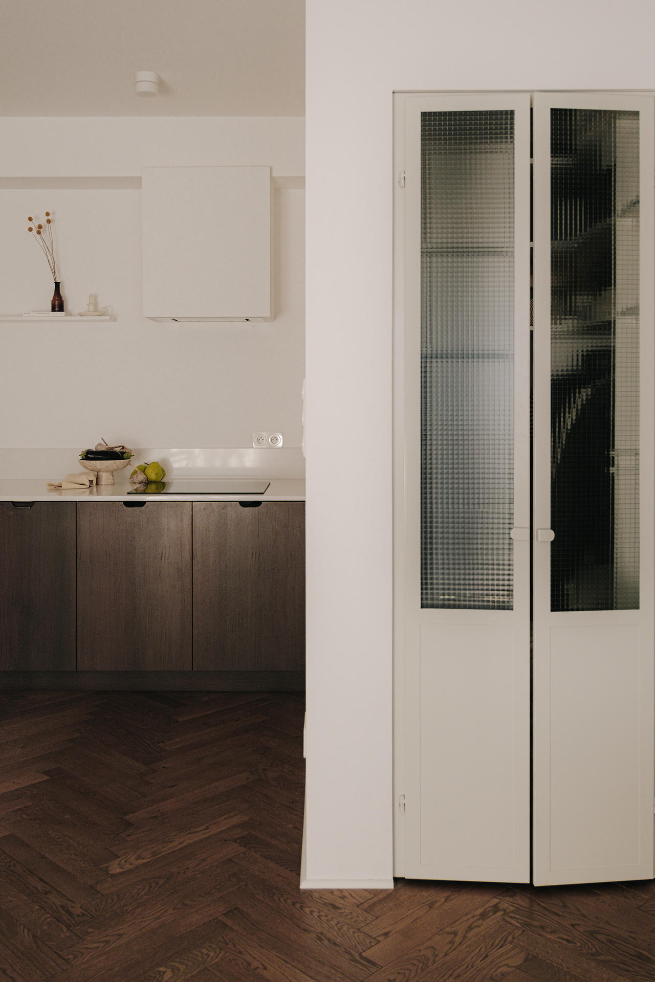 Bazą aranżacji jest jasna, spójna paleta – biel, ciepłe odcienie drewna i ciemnobrązowe forniry – ożywiona subtelnymi akcentami kolorystycznymi. Rytm nadaje dębowa podłoga ułożona w klasyczną jodełkę, a kamień, stal oraz starannie dobrane oświetlenie podkreślają elegancki charakter.