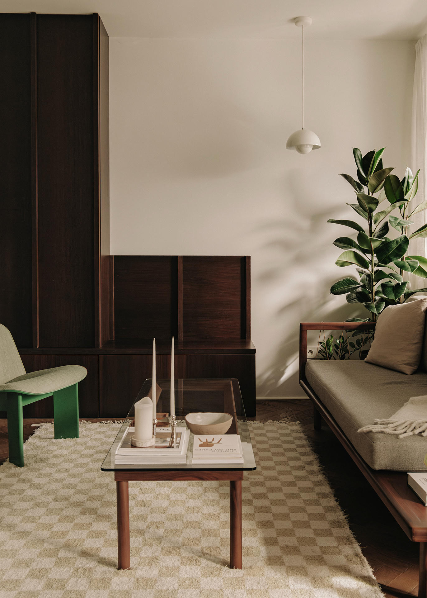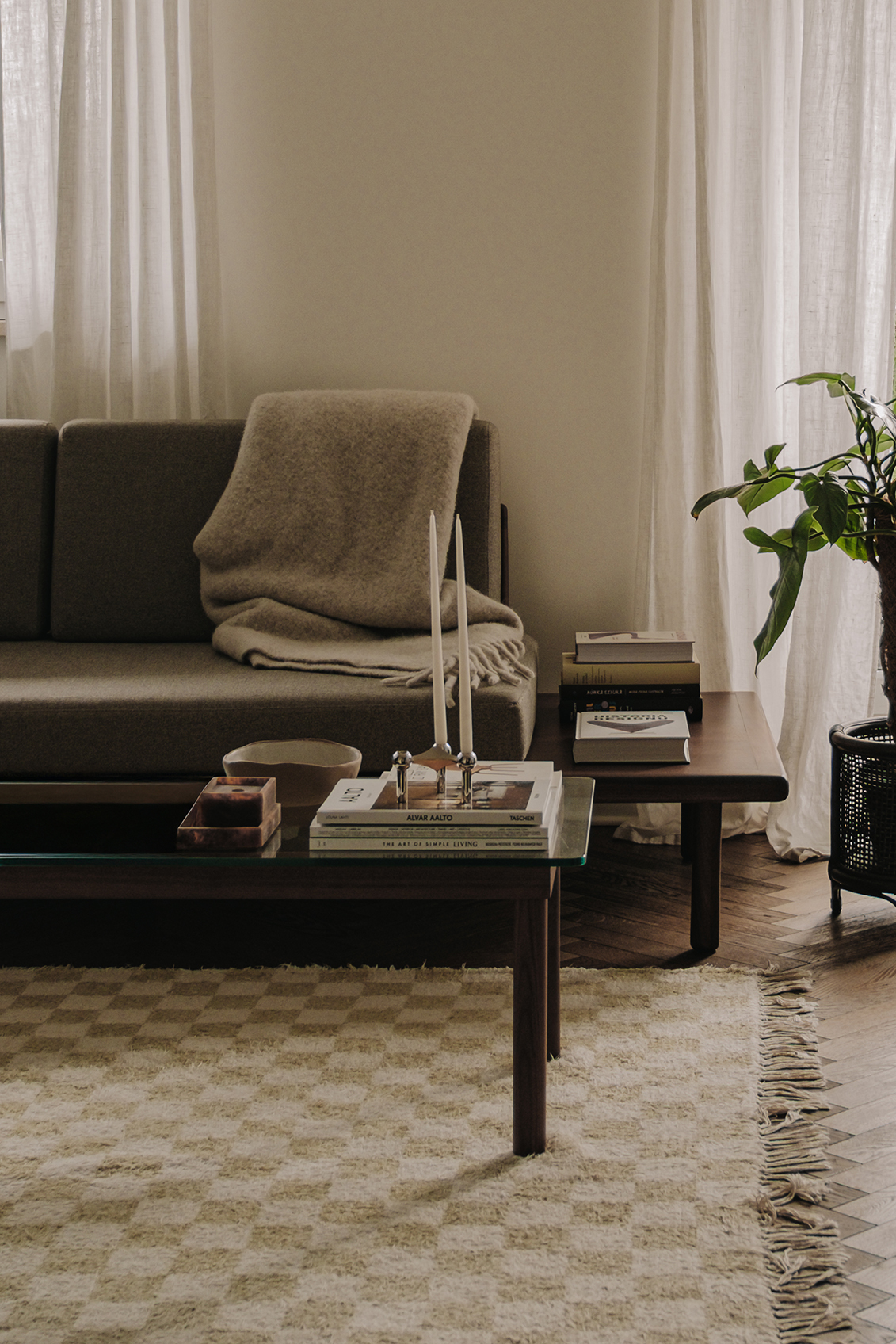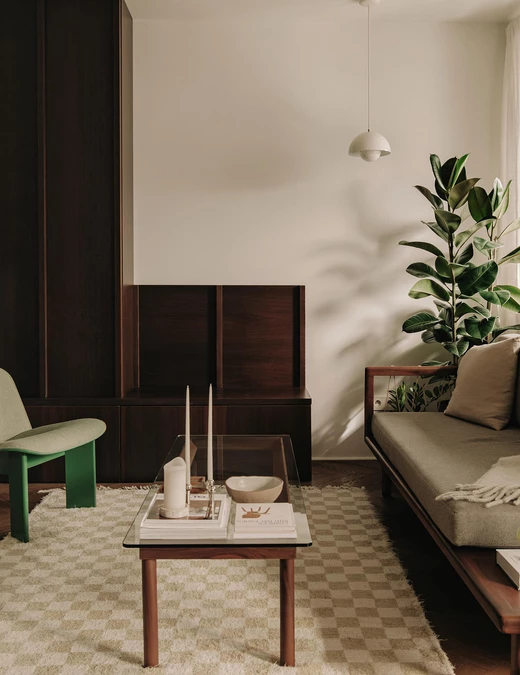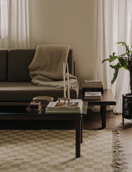 Salon powstał jako otwarta, przyjazna przestrzeń, która ma sprzyjać spotkaniom towarzyskim. W jego centrum stanęła sofa Sofa&Company z orzechową podstawą pełniącą także funkcję półek na książki – to przykład prostego, naturalnego i praktycznego rozwiązania. Strefę wypoczynku uzupełniają szklana ława Hay, dywan w kratę, klasyczne dodatki, dodatkowe siedzisko oraz miejsce na poduszki po drugiej stronie stolika.