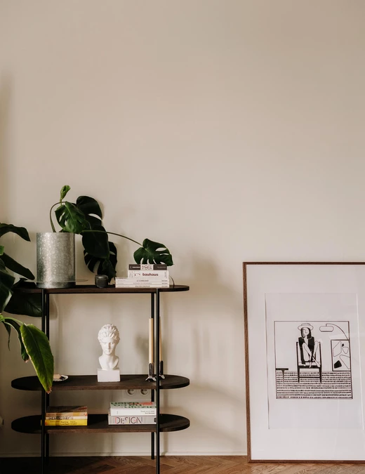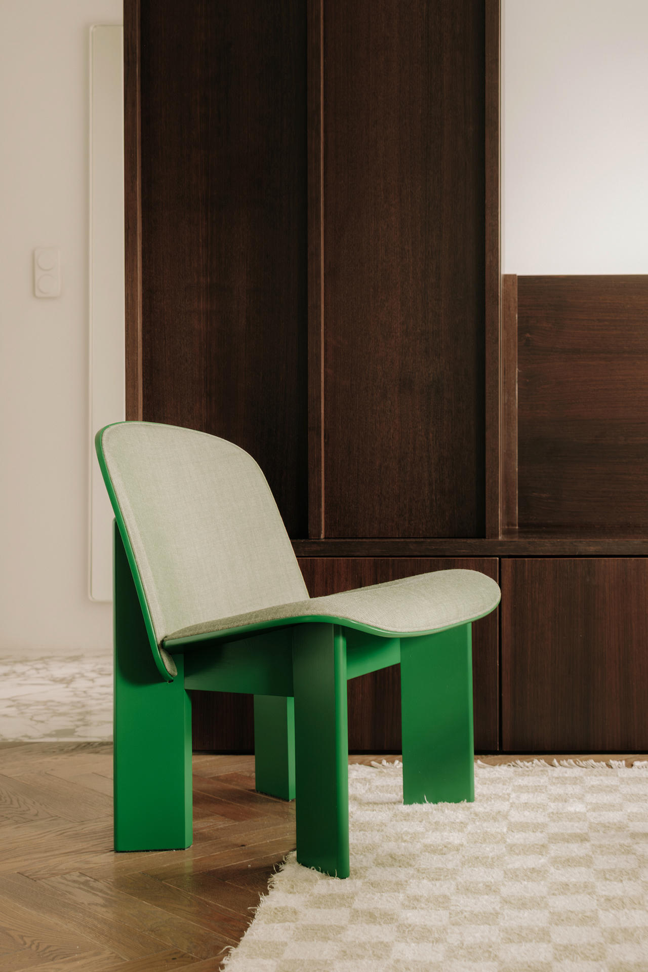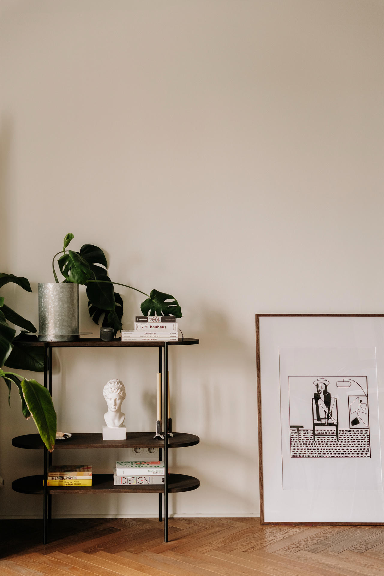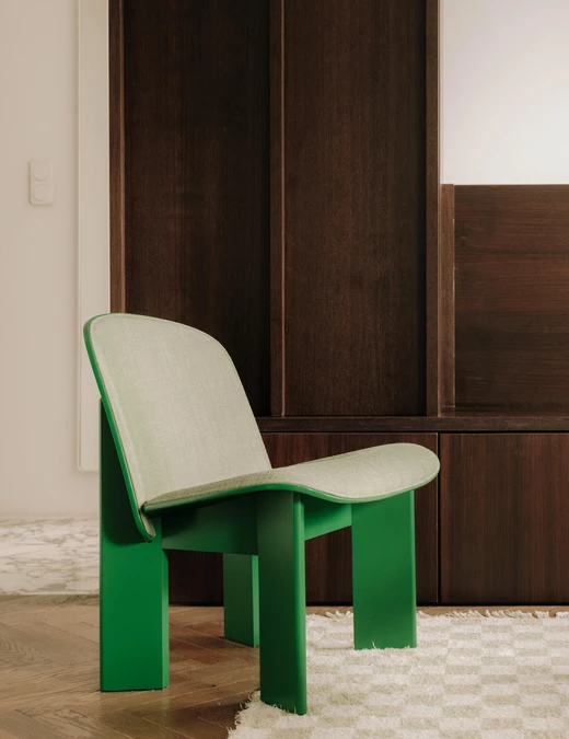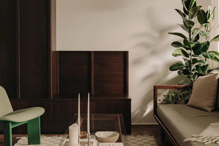 Salon powstał jako otwarta, przyjazna przestrzeń, która ma sprzyjać spotkaniom towarzyskim. W jego centrum stanęła sofa Sofa&Company z orzechową podstawą pełniącą także funkcję półek na książki – to przykład prostego, naturalnego i praktycznego rozwiązania. Strefę wypoczynku uzupełniają szklana ława Hay, dywan w kratę, klasyczne dodatki, dodatkowe siedzisko oraz miejsce na poduszki po drugiej stronie stolika.