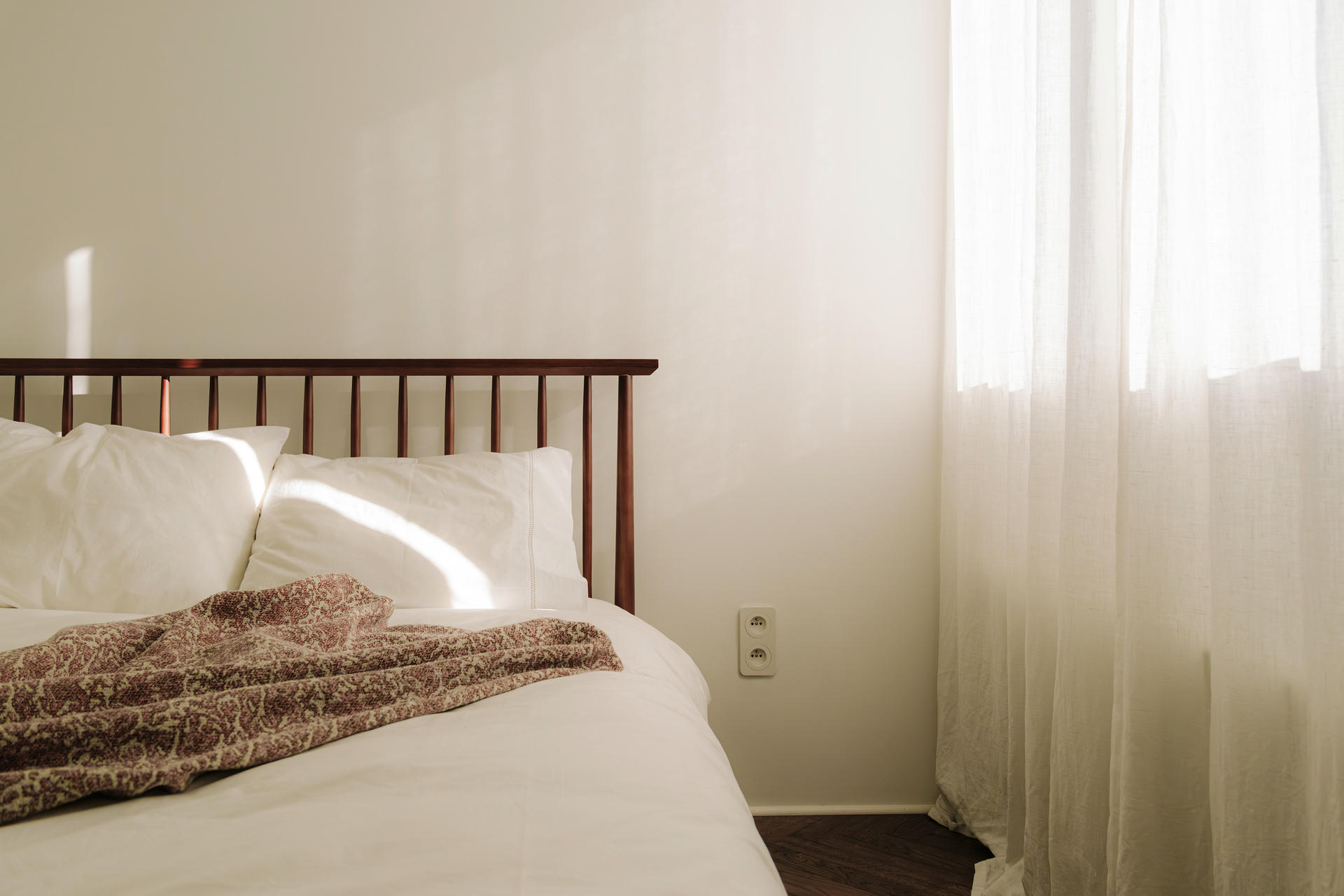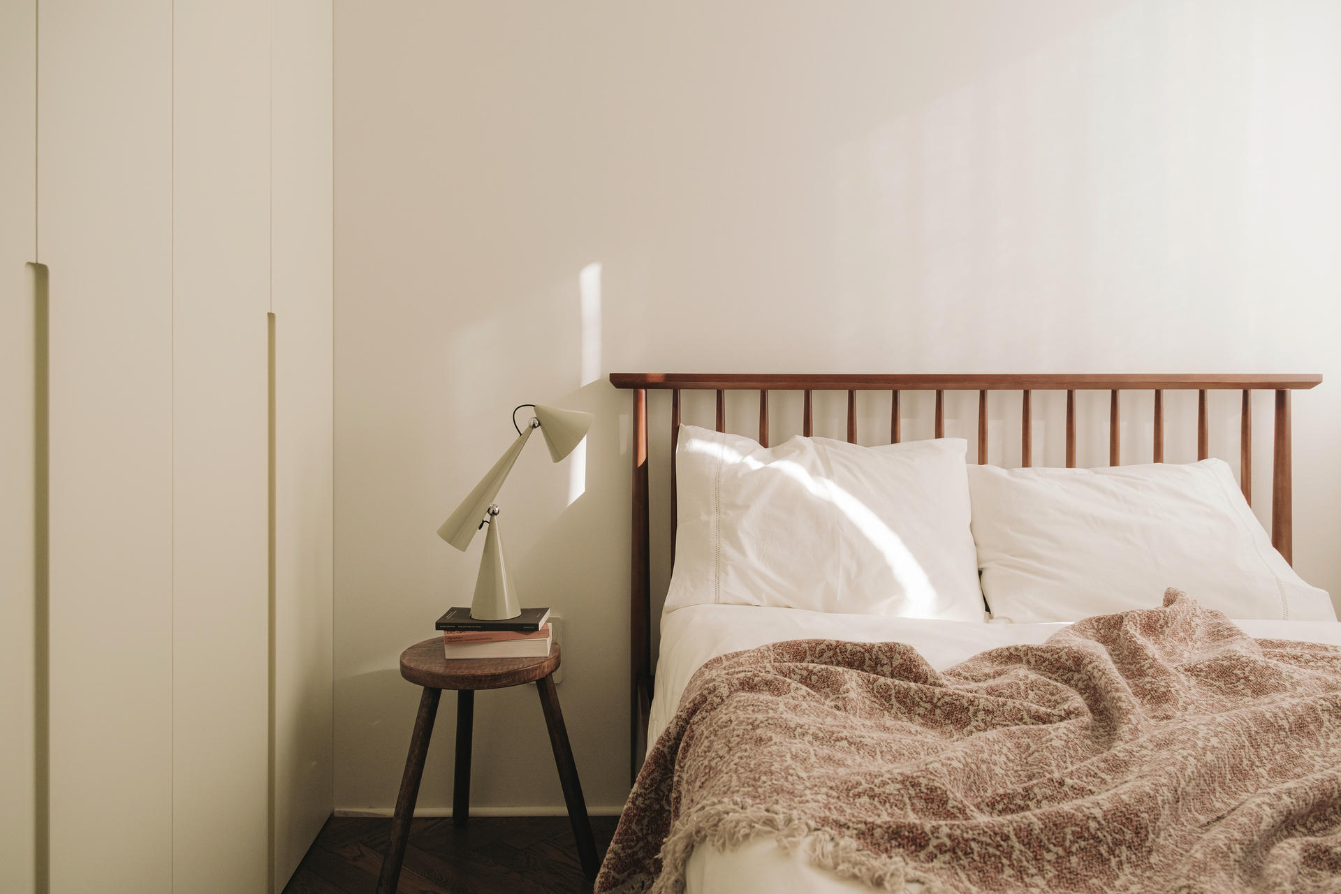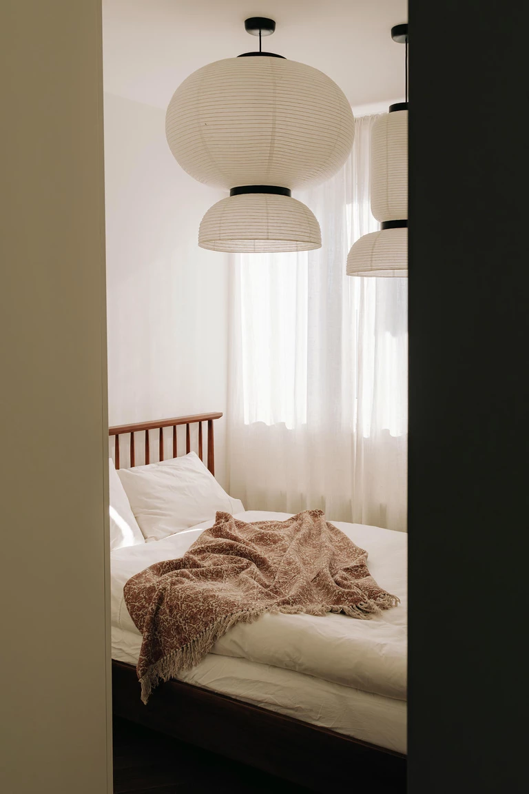 Sypialnia w tym wnętrzu ma służyć wyciszeniu i regeneracji. Ograniczona liczba elementów, neutralna kolorystyka i starannie dobrane materiały budują harmonijną atmosferę. Charakter wnętrza podkreślają lampy Formakami od &Tradition oraz lampka Toma Dixona – te detale przełamują oszczędność form.