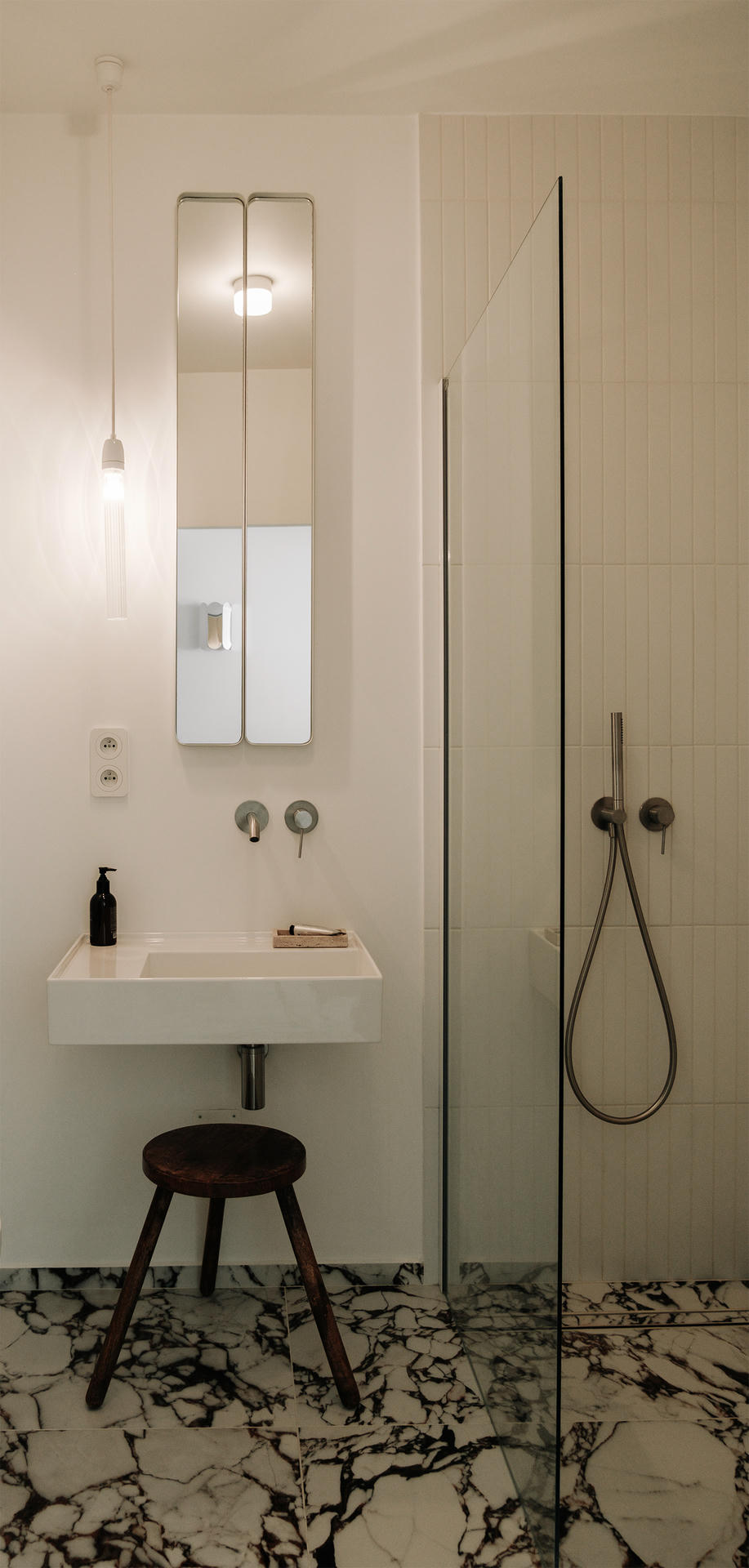 Łazienka kontynuuje stylistykę mieszkania. Na jednej ze ścian zastosowano płytki Parallell od tego samego producenta co na podłodze, dzięki czemu zachowano kompozycyjną spójność. Zaprojektowana przez Magdalenę Herbę witryna z frontami ze zbrojonego szkła nawiązuje do wcześniej wspomnianych stalowych drzwi w garderobie, a ponadto wprowadza industrialny akcent. Nietypowym rozwiązaniem jest rezygnacja z płytek za umywalką. Zamiast tego ścianę pokryto wysokiej jakości farbą zmywalną i wodoodporną, uzyskując bardziej naturalny efekt bez kompromisów w zakresie funkcjonalności.
