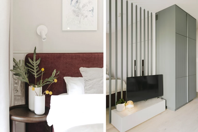 Wydzielenie sypialni w każdym z dwóch mieszkań jest umowne i niebanalne, wykonane w taki sposób, by nie ograniczać naturalnego światła. W pierwszym mieszkaniu jest to industrialna ściana z geometrycznym wzorem urozmaicającym wnętrze, w drugim zielone wałki.