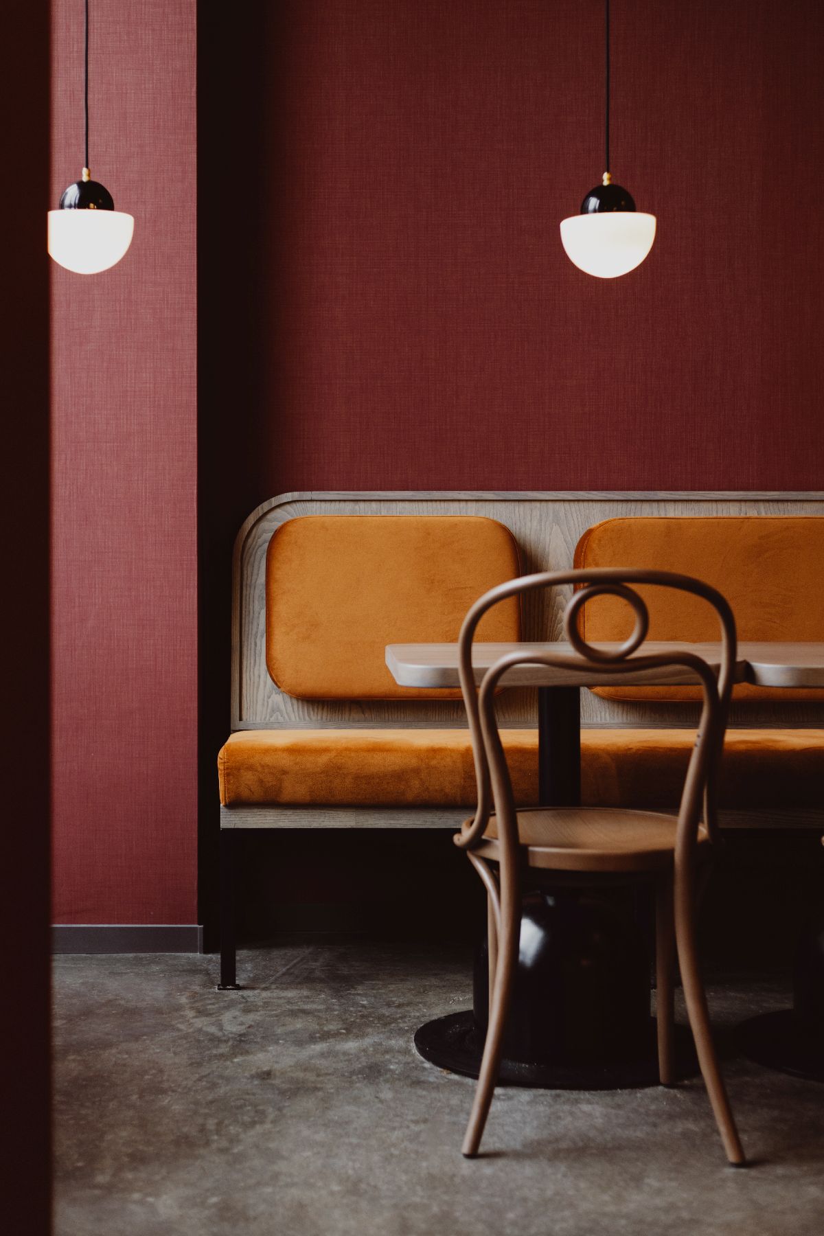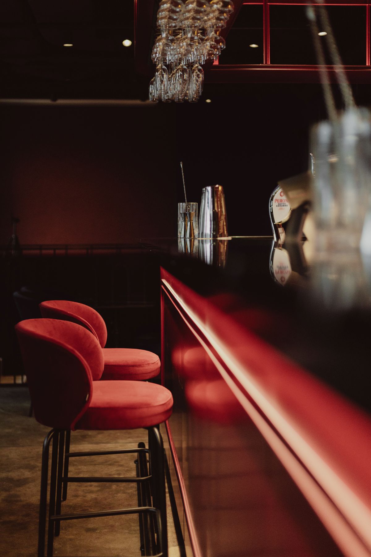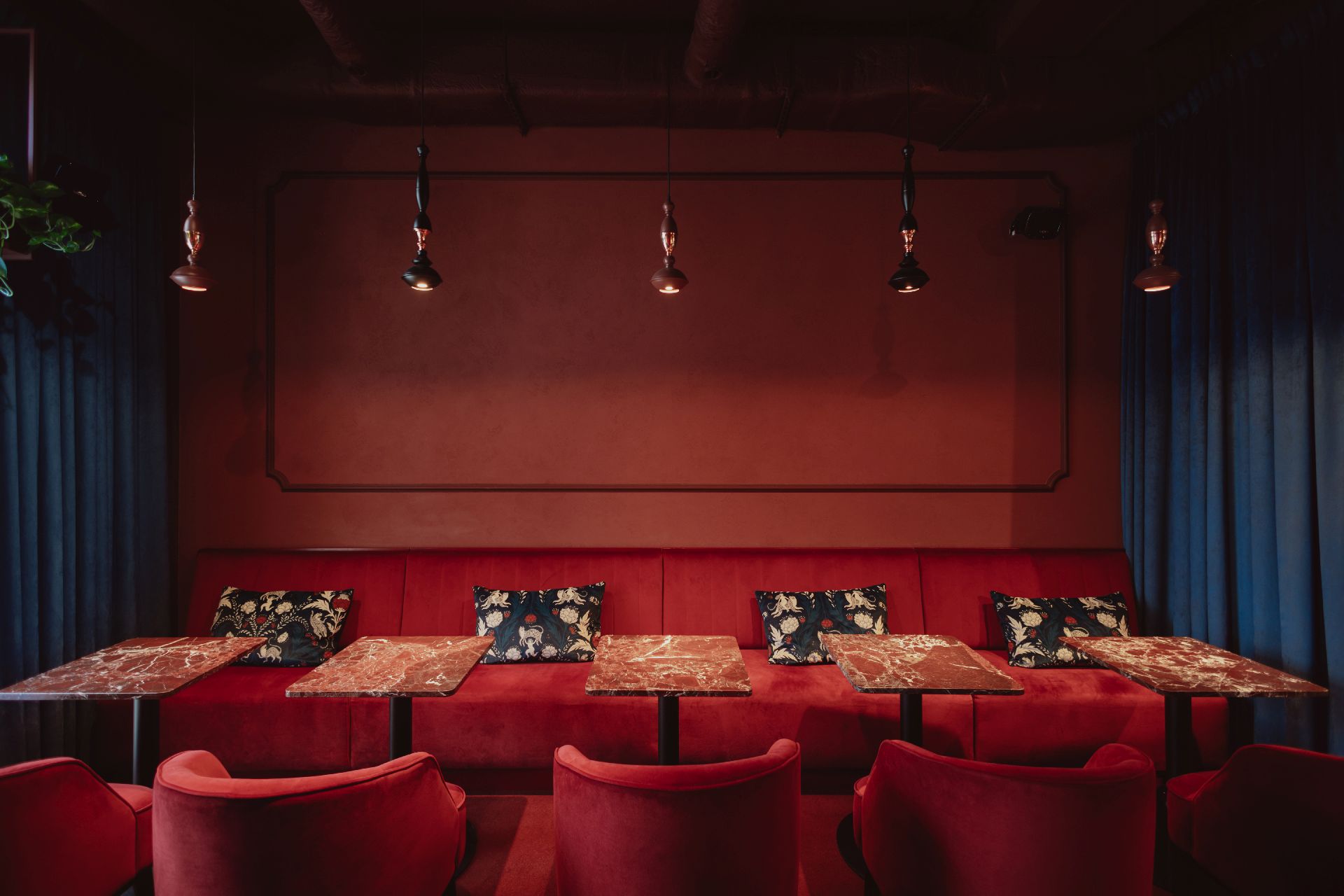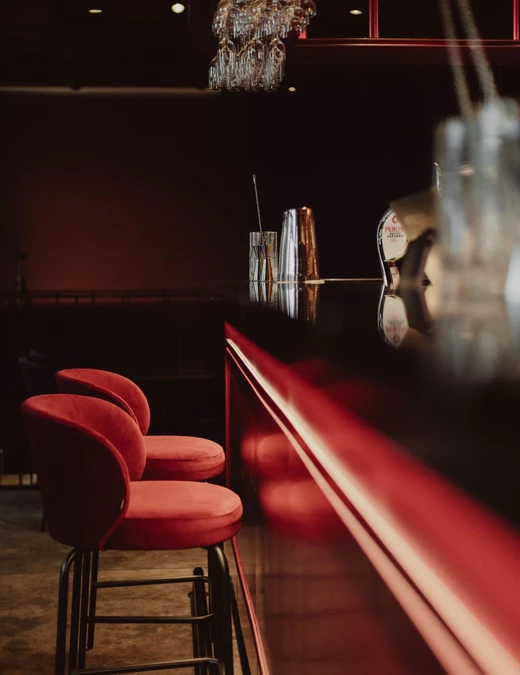 „Duszą tej przestrzeni jest delikatnie rzeźbiony bar, wykończony stalą w odcieniu burgundu, który nadaje wnętrzu współczesny akcent i dyskretnie odbija światło. Miękkie tkaniny współistnieją tu z secesyjnymi sztukateriami i szlachetnymi materiałami, a całość dopełnia grafika Barta Sucharskiego” – komentuje Maja Skołysz z M19 Architekci.