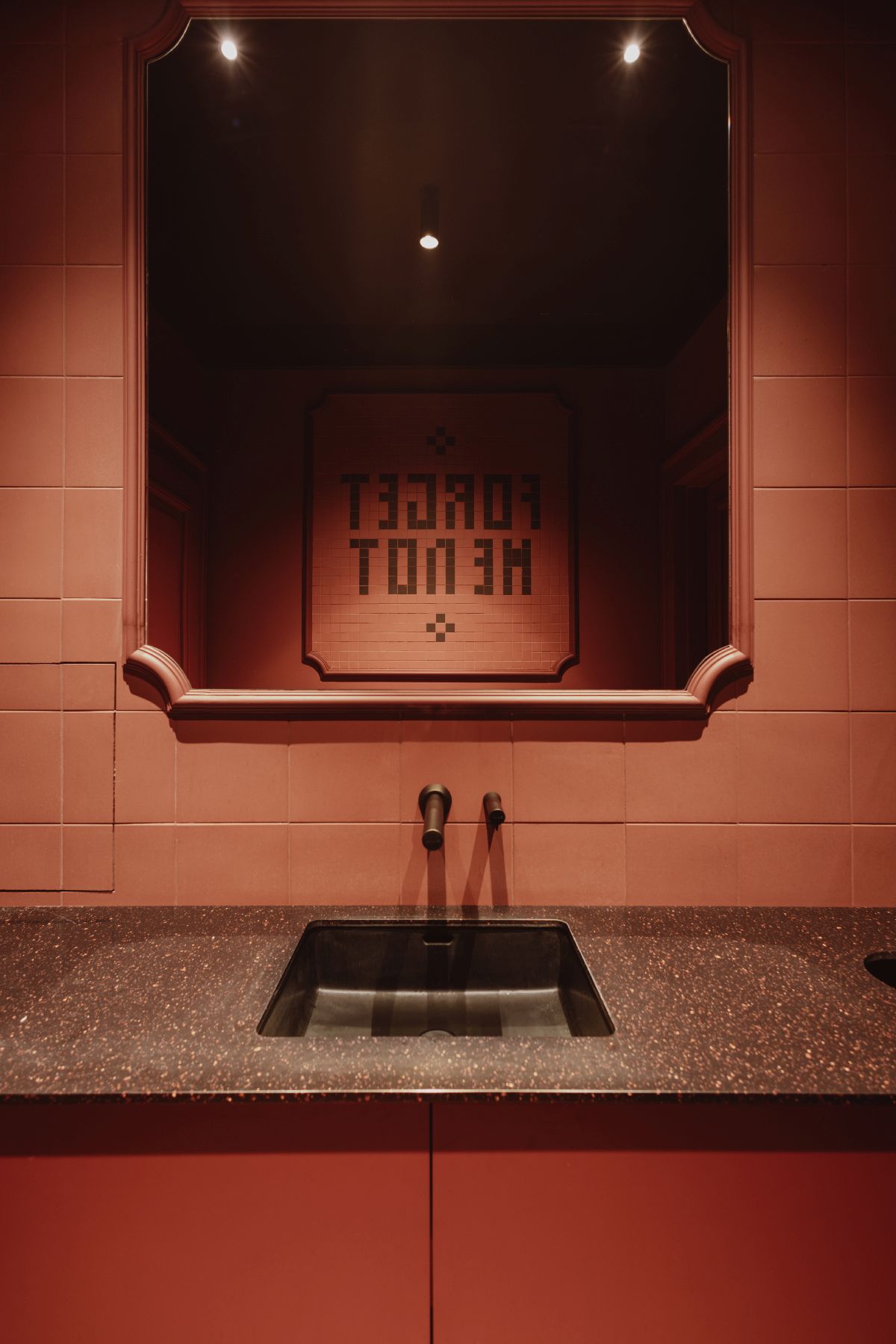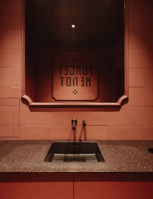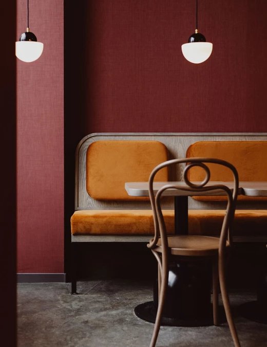 Podróż kończy się na piętrze – w przestrzeni bardziej kameralnej, otwartej na miasto dzięki historycznym witrynom. To miejsce codziennych rytuałów: kawy w ciągu dnia i dłuższych, wieczornych rozmów przy koktajlu. Miękkie sofy oraz stonowana paleta burgundu i granatu budują nastrój wyciszenia, a nastrojowe światło załamuje się na tkaninach i celowo niedoskonałych tynkach w technice wabi-sabi.