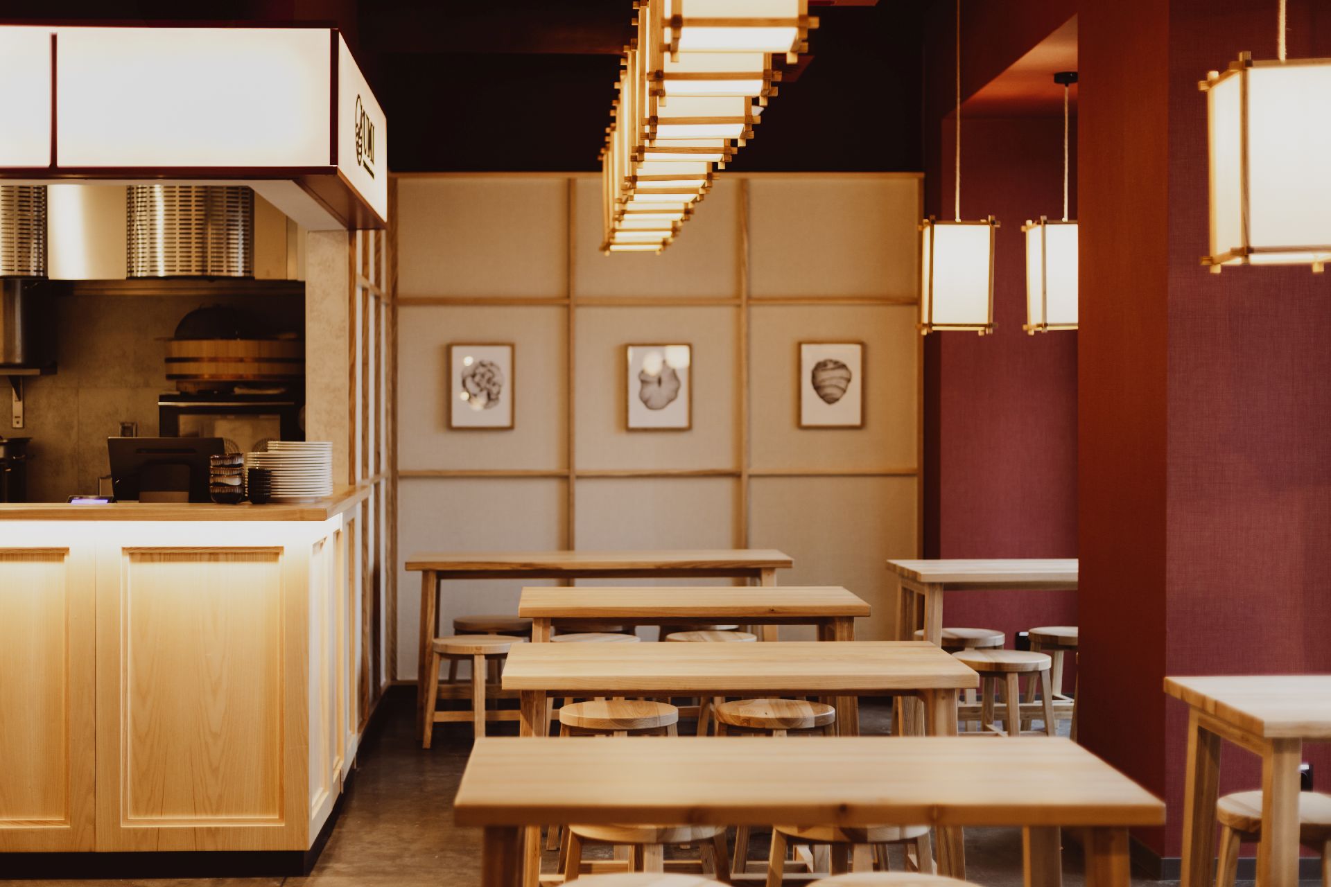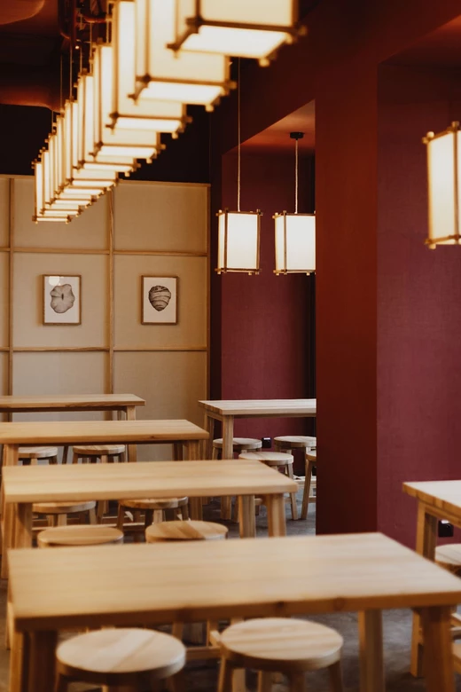 Dalej wnętrza stopniowo się wyciszają. Część inspirowana Azją wprowadza estetykę japandi: jasną, uporządkowaną i oszczędną. Minimalistyczne meble, jasne drewno, tkaniny na ścianach oraz miękkie światło papierowych lampionów tworzą atmosferę spokoju i pozwalają na chwilę wytchnienia.