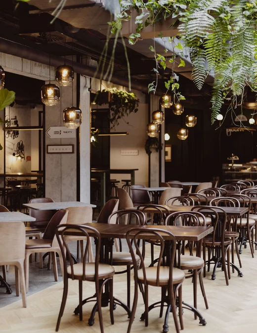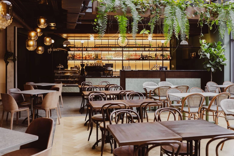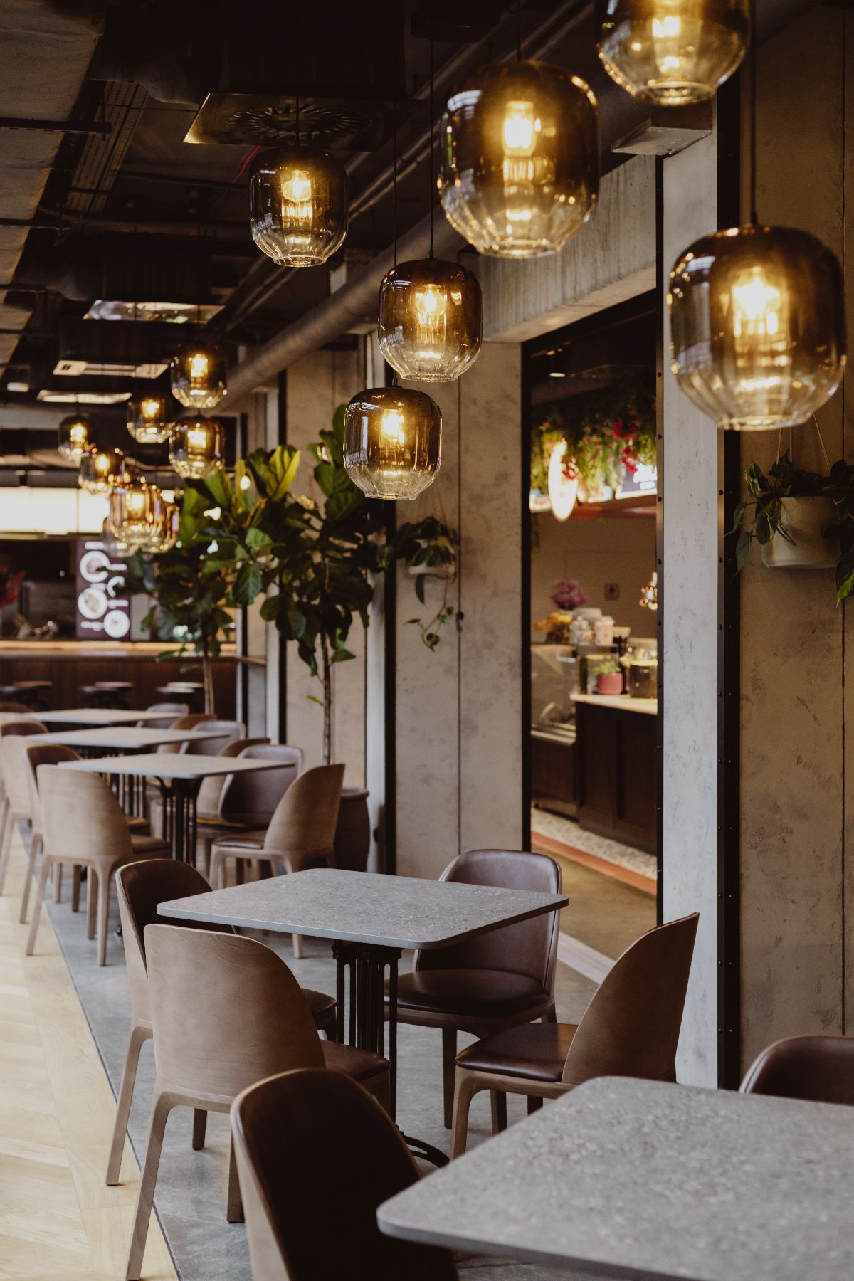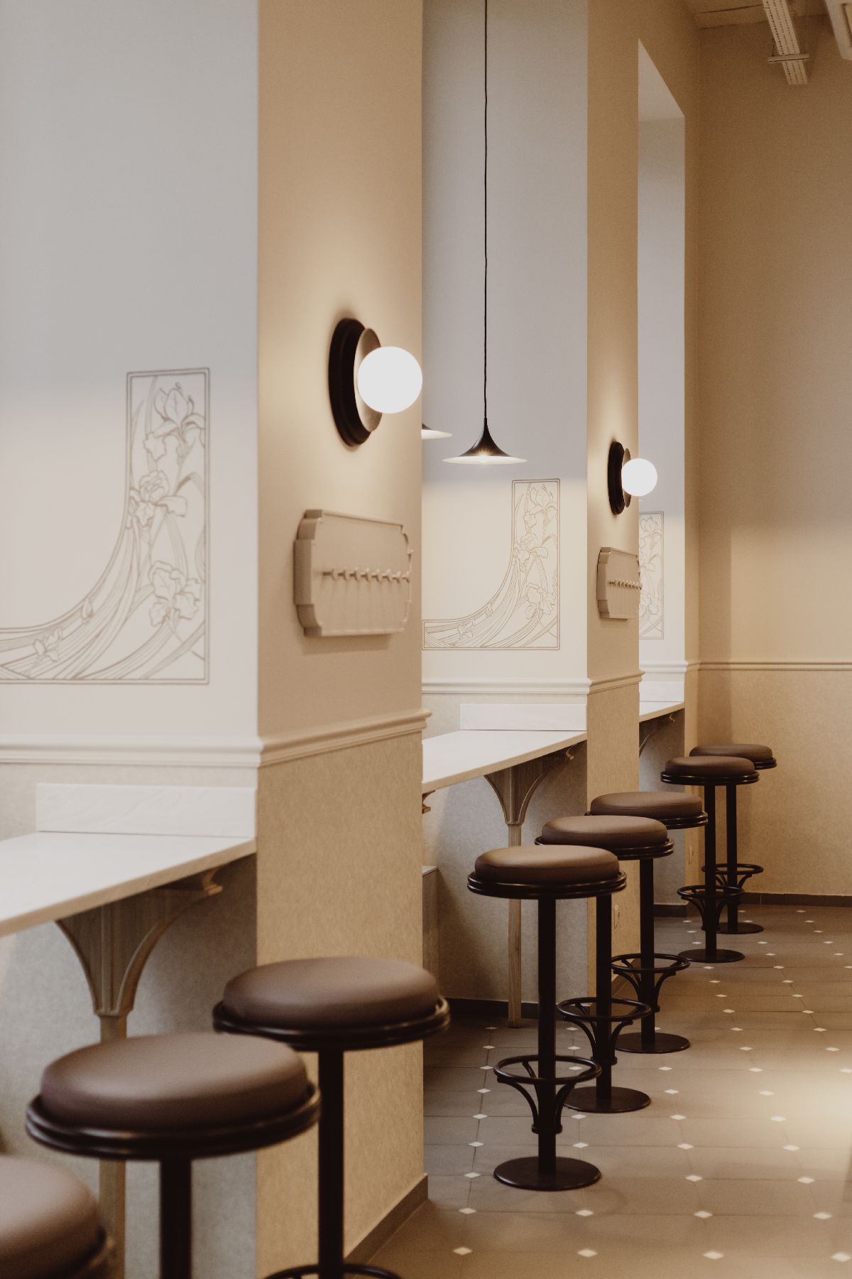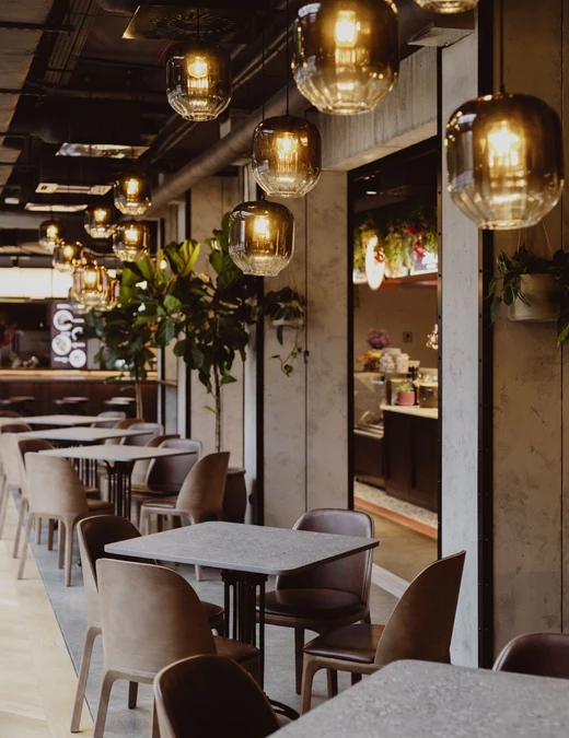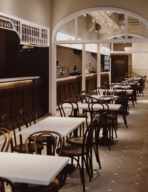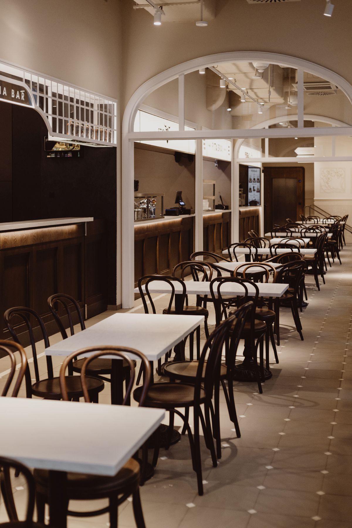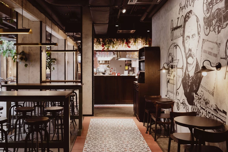 Wysokie sklepienia, rytmiczny układ witryn i dekoracyjne detale przywołują elegancję dawnych galerii handlowych i pasaży dworcowych. Posadzki, łuki oraz ręcznie malowane ornamenty budują atmosferę początku XX wieku, a centralny bar o łukowej formie, wykończony orzechowym fornirem, nadaje przestrzeni reprezentacyjny charakter. Tapicerowane siedziska i odniesienia do wagonów kolejowych wprowadzają motyw podróży.