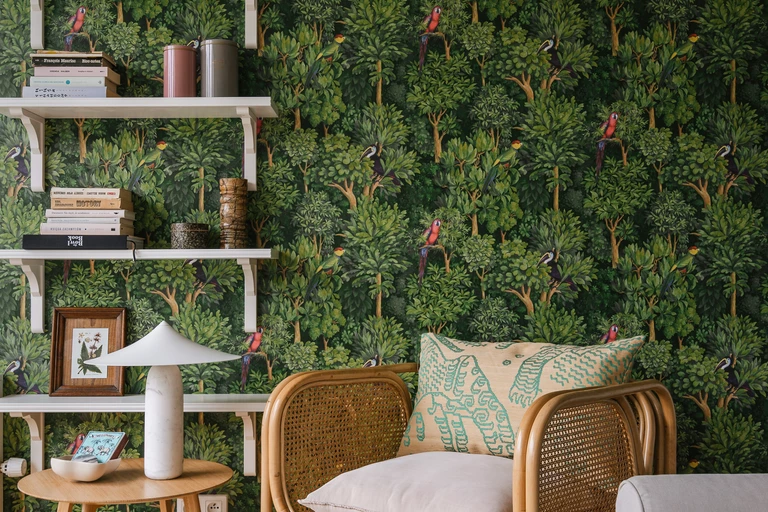 W salonie zdecydowano się na zmianę tapety, Zuza jest fanką zieleni dlatego najbardziej spodobał się jej motyw dżungli. Białe, ryflowane półki tworzą subtelną biblioteczkę, a ratanowy fotel dodaje lekkości. Orientalne akcenty: zielony lampion nad stołem i kamienna lampa stołowa Aromas dodają tajemnicy.