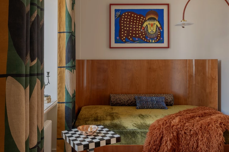 Sypialnia wypełniają miękkie tkaniny Pierre Frey, które można dostrzec na zasłonach, poduszkach, narzucie i pledzie. Podobnie jak w pozostałych pomieszczeniach mieszkania, tutaj również nie zabrakło dzieł sztuki. Nad łóżkiem zawisł obraz klasyka ukraińskiego malarstwa Josypa Bokszaja „Jesienne ciepło” (1928), a nad konsolą – nastrojowy pejzaż Alberta Erdeli z lat 30. Ramę wykonanego na zamówienie łóżka obito fornirem z korzenia topoli. Garderobę wykończono z równie dużą dbałością o detal – jej tylną ścianę pokryto francuską tapetą Papermint Paris, a mosiężne uchwyty w kształcie żab wykonała manufaktura Bronzetto.