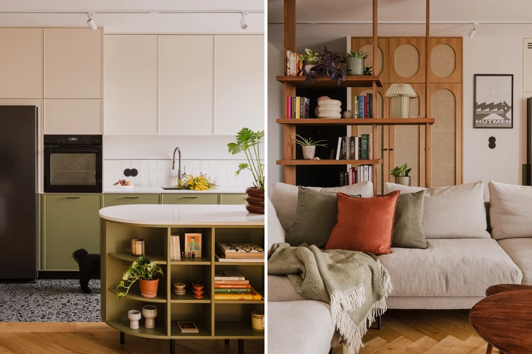 Pierwszym meblem, który przykuwa uwagę po wejściu do mieszkania, jest drewniany regał, który oddziela strefę wejściową od salonu. W przedpokoju znalazły się także komfortowe siedzisko i szafa z frontami z rattanu. Pas płytek terrazzo prowadzi w stronę beżowo-oliwkowej zabudowy kuchennej, obok której stanął zaoblony półwysep na stalowych nóżkach. W tym meblu od strony kuchni przechowywane są talerze, garnki i przyprawy. Od strony jadalni wyspa pełni funkcję regału na książki. Stół i cztery krzesła o dwóch różnych modelach tworzą razem eklektyczny miszmasz, który koresponduje z pozostałą częścią salonu – strefą odpoczynku i kącikiem do pracy.