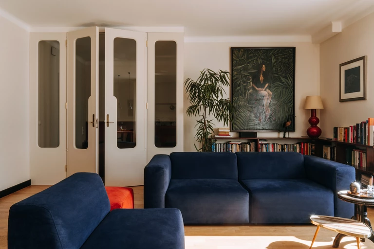 Ideą aranżacji było sprawienie, by gospodarze czuli się w mieszkaniu swobodnie. Mając to uwadze, architektka zaplanowała ustawienie w salonie mobilnych foteli, które można przemieszczać i tworzyć różne układy w zależności od sytuacji. Wiele mebli wykorzystano ponownie, w tym należące do właścicieli sofę, stół, krzesła i wyspę kuchenną, która wcześniej pełniła rolę biurka. Zaprojektowany cokół podniósł wyspę na odpowiednią wysokość, niezbędną do przyrządzania posiłków.