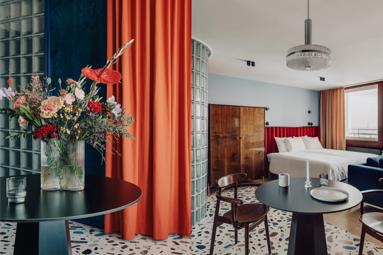 W celu dyskretnego nawiązania do architektury modernistycznej w łazience zastosowano zaokrąglone ściany wykonane ze szklanych luksfer. Dzięki nim pomieszczenie, które nie miało okna, zyskało naturalne światło dzienne. Wnętrze przedpokoju, części kuchennej oraz łazienki zostało wyłożone efektownymi włoskimi płytkami terazzo, które nawiązują do popularnego w okresie PRL lastryka. Projekt płytek został stworzony przez Giovanniego Romanellego dla marki Fioranese.