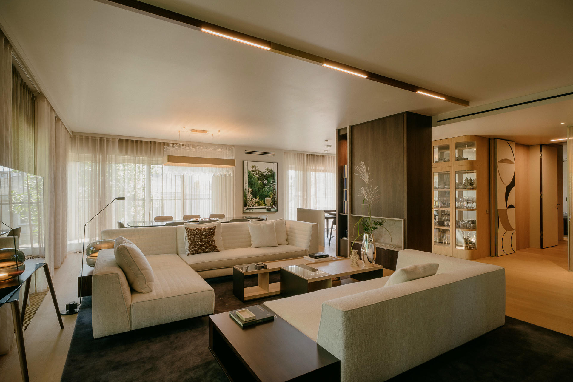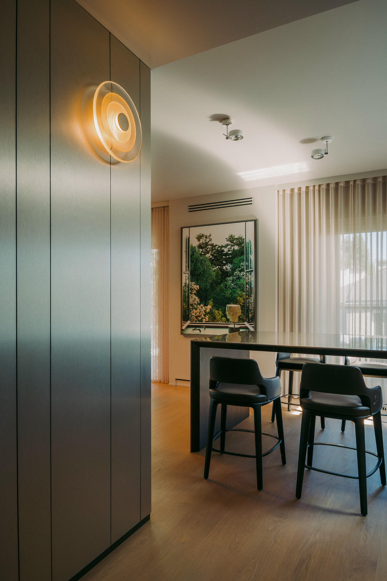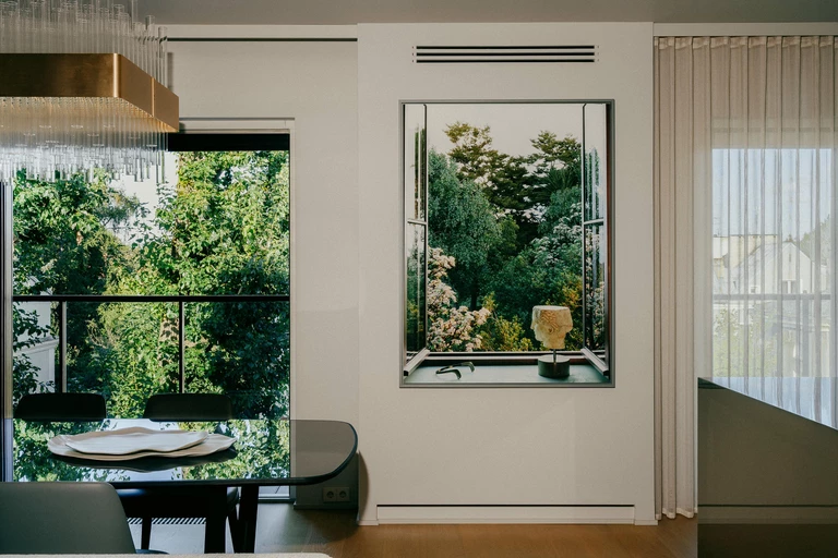 W projekcie pojawiają się także akcenty artystyczne. Na drzwi prowadzące z holu do garderoby trafiło monumentalne panneau autorstwa Karoliny Bielawskiej. W jadalni między oknami zawisł pejzaż autorstwa Giuseppe Lo Schiavo, który szczególnie latem wygląda jak kolejne okno.