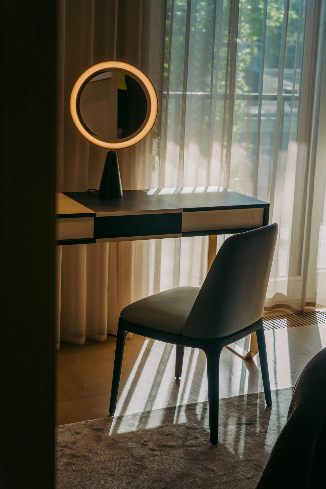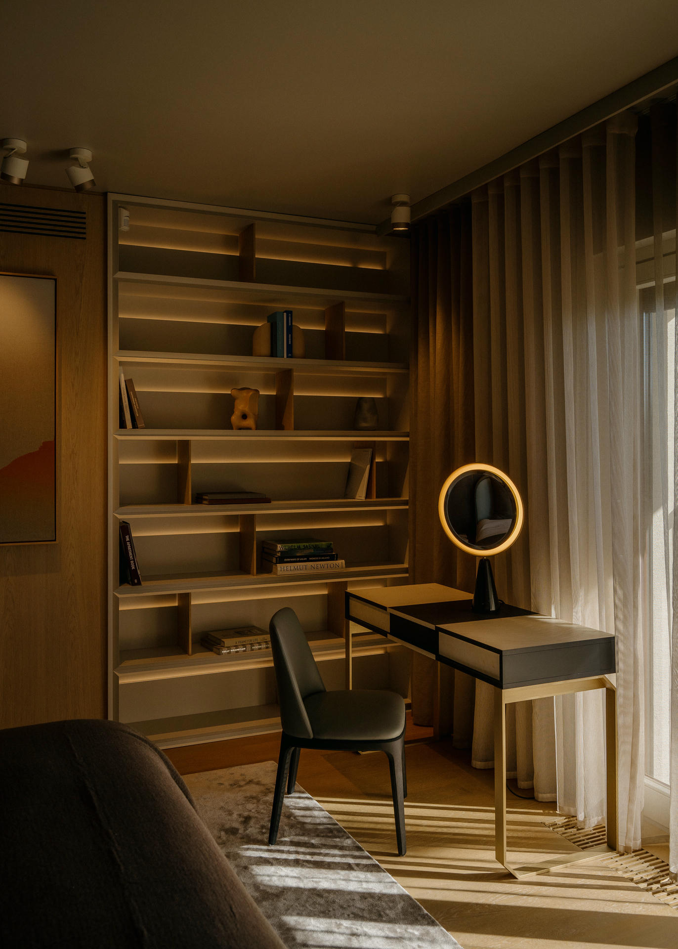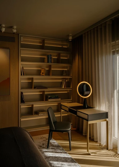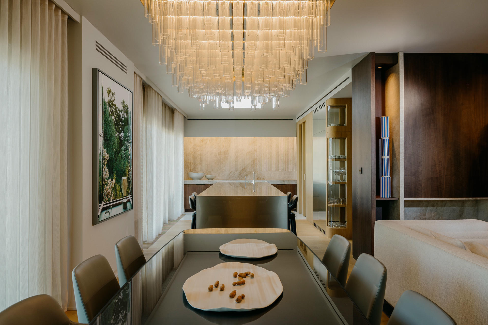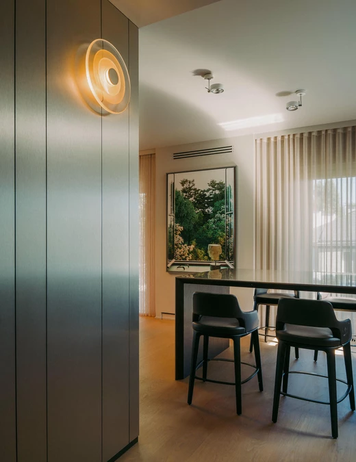 Całe wnętrze pozostaje w ruchu. Kolory, faktury, a nawet kształty wydają się zmieniać wraz z porą dnia i sposobem korzystania z przestrzeni. Szczególnie efektownie widać to w zmiennych refleksach światła na polerowanych powierzchniach i w szkle.