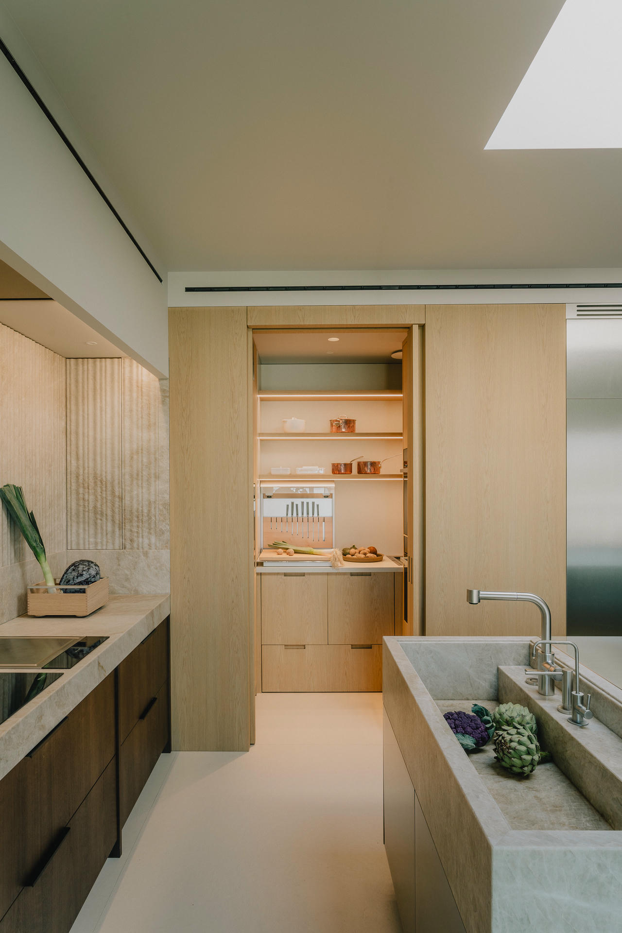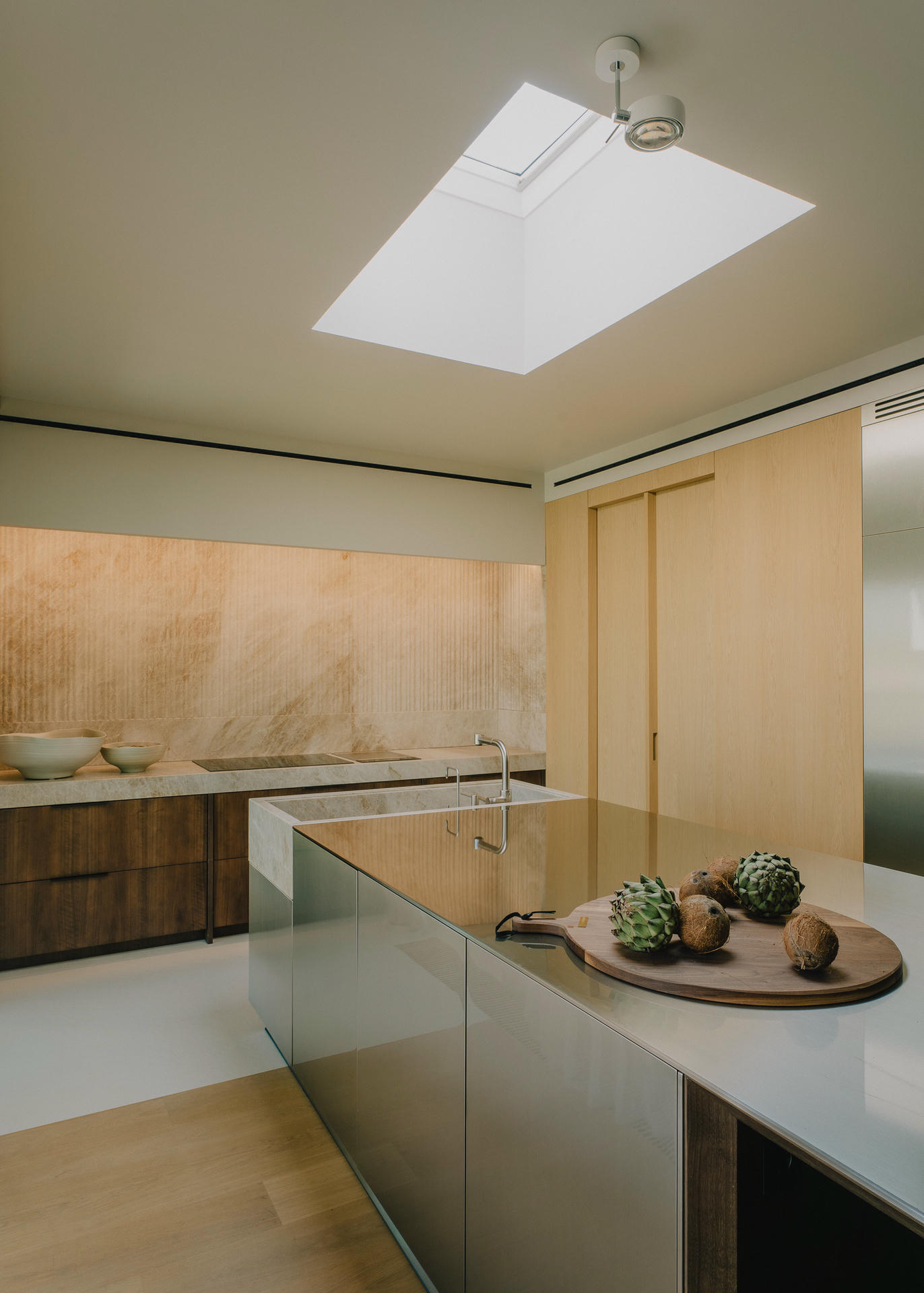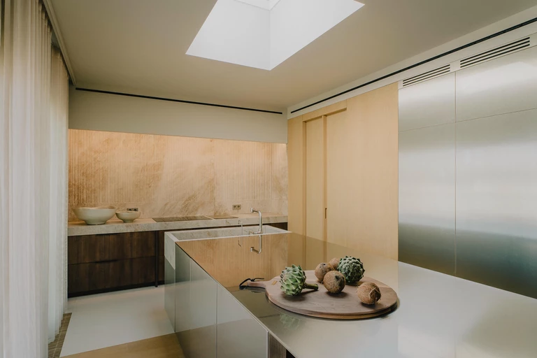 Kuchenną wyspę wykonano ze szczotkowanej stali. Jej powierzchnia działa jak ogromne lustro – odbija otoczenie i przejmuje jego kolory, dzięki czemu metal wydaje się zaskakująco ciepły. Podobną rolę pełnią stalowe panele ścienne widoczne tuż obok. Ich szczotkowana faktura łagodzi surowość materiału i sprawia, że metal staje się miękkim wizualnie tłem dla przestrzeni.