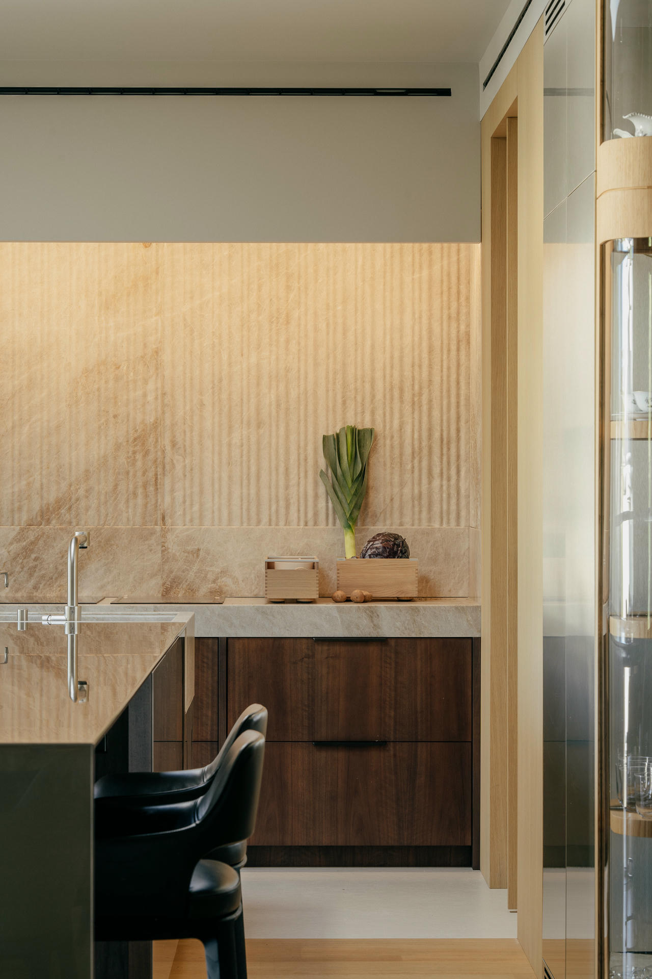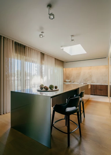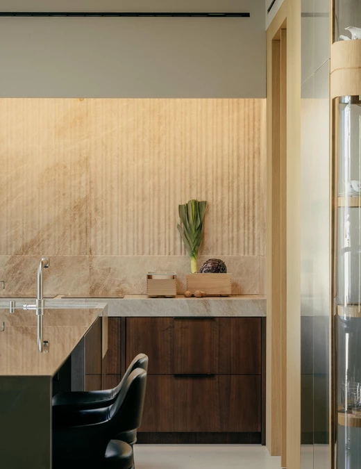 W tym apartamencie twardy kwarcyt zachowuje się jak miękka tkanina, polerowana stal nie tylko odbija otoczenie, ale też wydaje się chłonąć jego ciepło, a szkło przechowuje ślady pracy rąk artysty. Zespół NOKE Architects postanowił sprawdzić, jak daleko można przesunąć granice znanych materiałów i co się stanie, gdy potraktuje się je w sposób zupełnie inny niż zwykle.