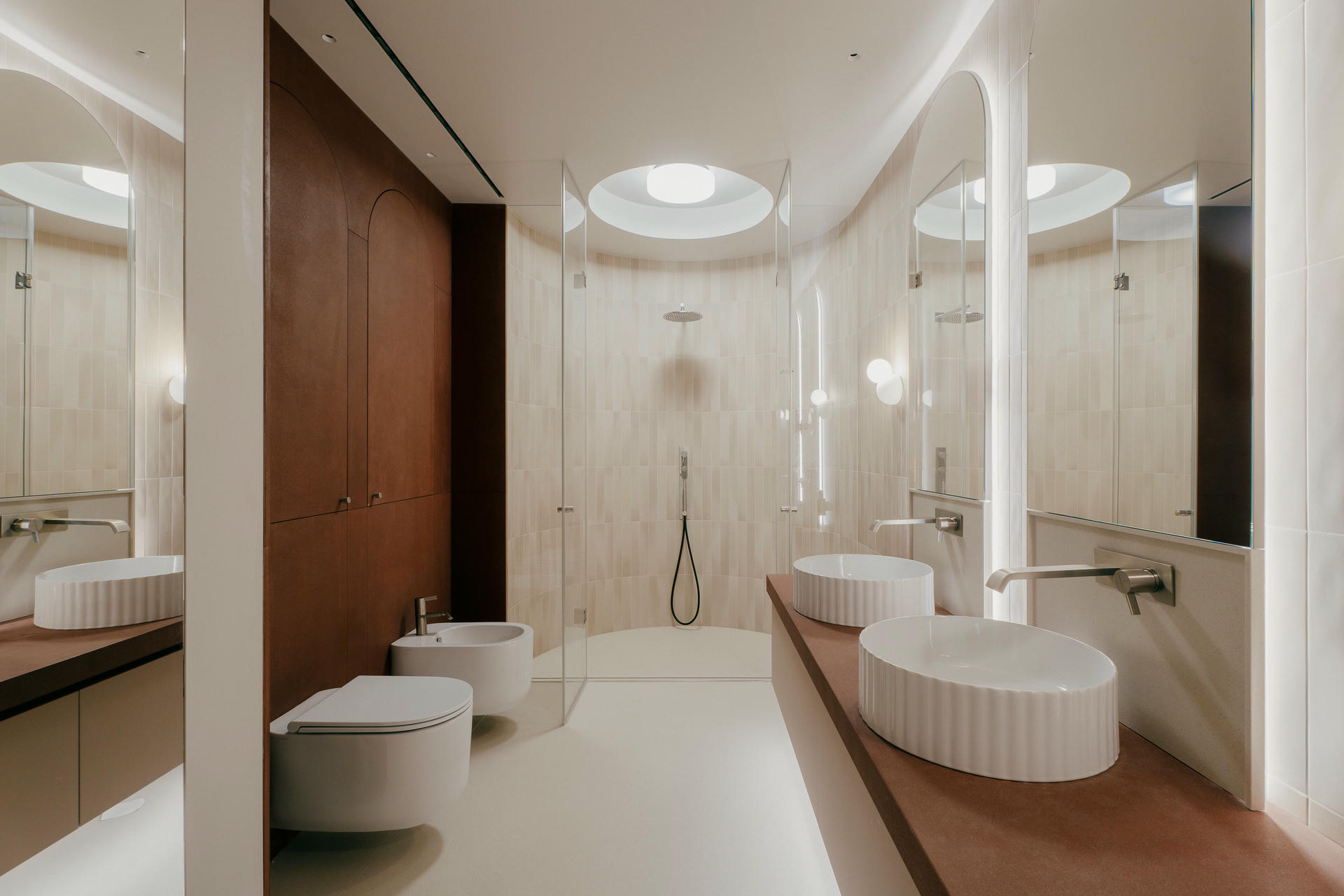 W łazience zastosowano rzadko spotykany w tego typu pomieszczeniach wapień o różowawym odcieniu, który po impregnacji nabrał głębi koloru. Wykonano z niego blat oraz niezwykle cienkie płyty pokrywające fronty mebli. Wnętrze łazienki – i nie tylko – opiera się na zestawieniach kontrastów: powierzchnie szorstkie spotykają się z gładkimi, a płaskie z fakturowanymi. Wyjątkowy nastrój buduje także okrągły świetlik w suficie.