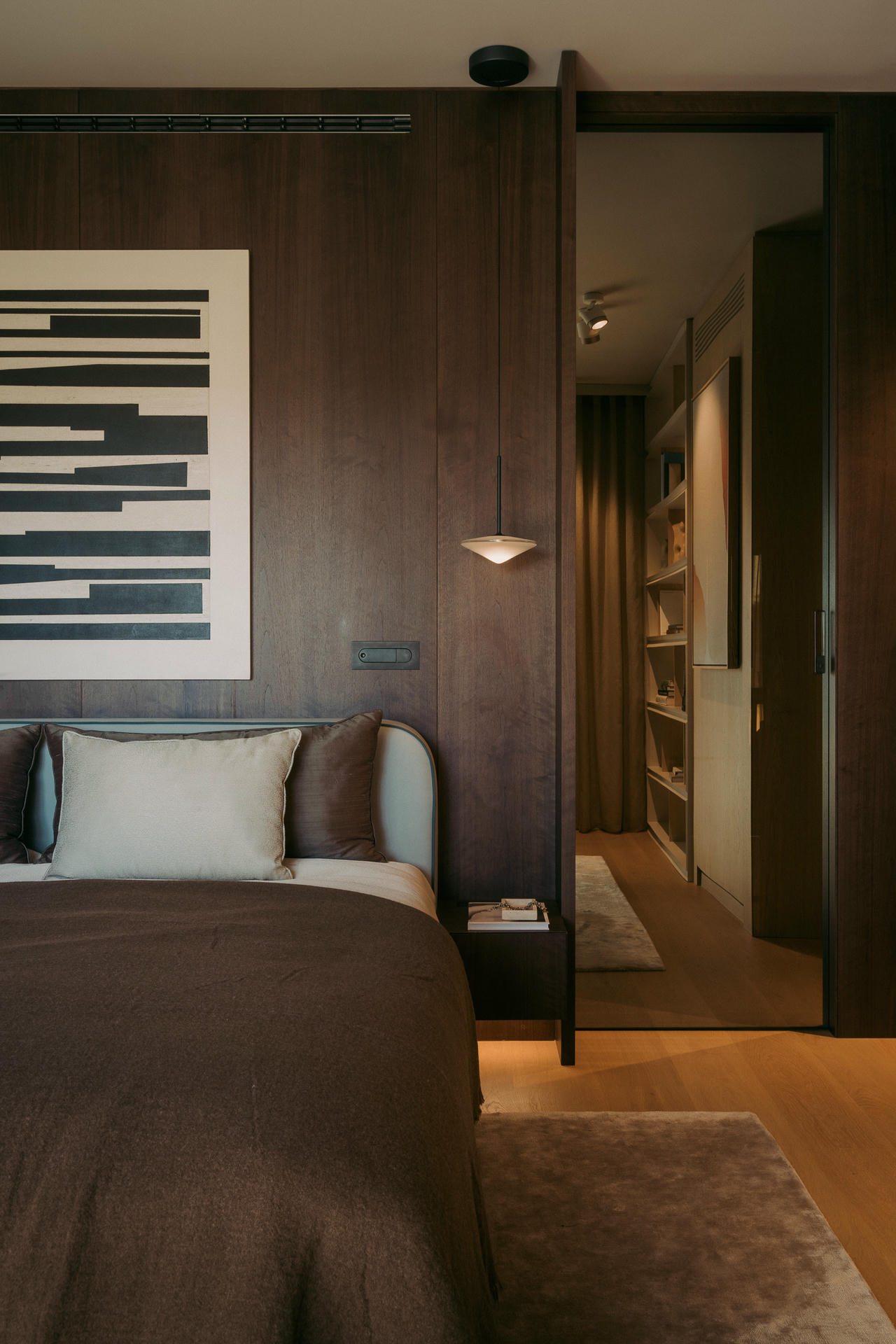 Pojawiają się tu minimalistyczne okładziny z drewna: jasne w holu, jadalni i spiżarni oraz ciemniejsze w salonie i sypialni. Oprócz koloru różnią się także sposobem opracowania powierzchni. W zależności od planowanego nastroju projektanci wraz z wykonawcą projektu, Manufakturą WIRCHOMSKI, stosowali zarówno gładki fornir, jak i szczotkowany, z wyraźnie pogłębioną strukturą słojów.