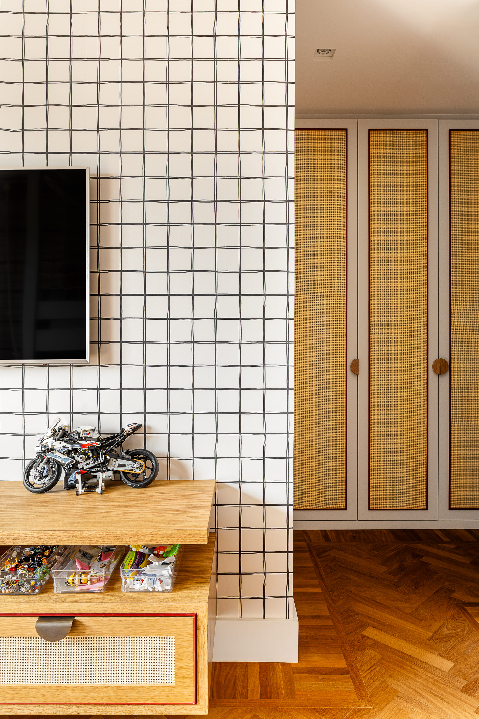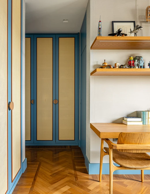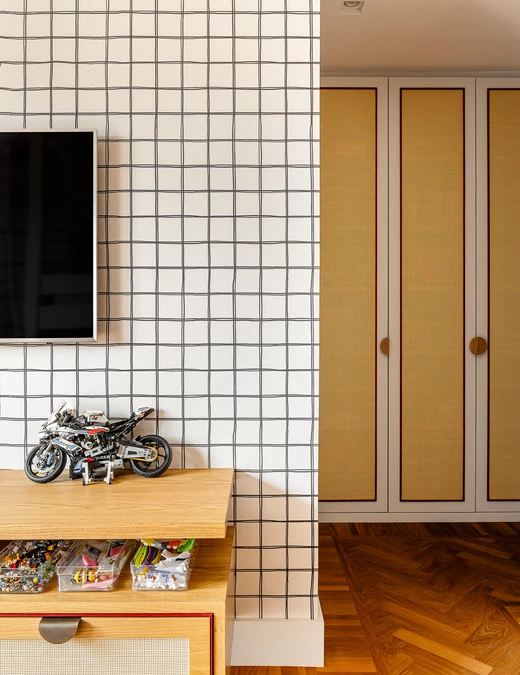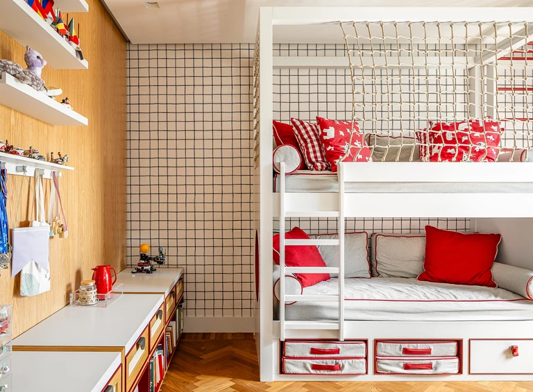 W przestrzeniach dla dzieci architekci postawili na harmonię między zabawą a porządkiem. Prywatne pokoje utrzymano w stonowanych barwach sprzyjających odpoczynkowi, ale bawialnia ożywa intensywniejszymi kolorami, szufladami, schowkami, drabinkami i łóżkami piętrowymi z siatkami – wszystkim, co wspiera rozwój, ruch i wyobraźnię najmłodszych domowników.
