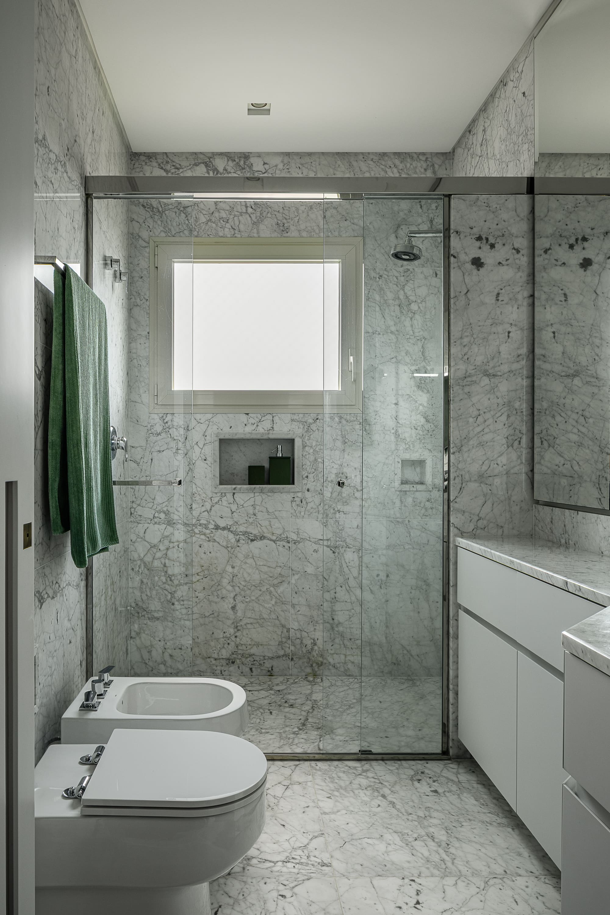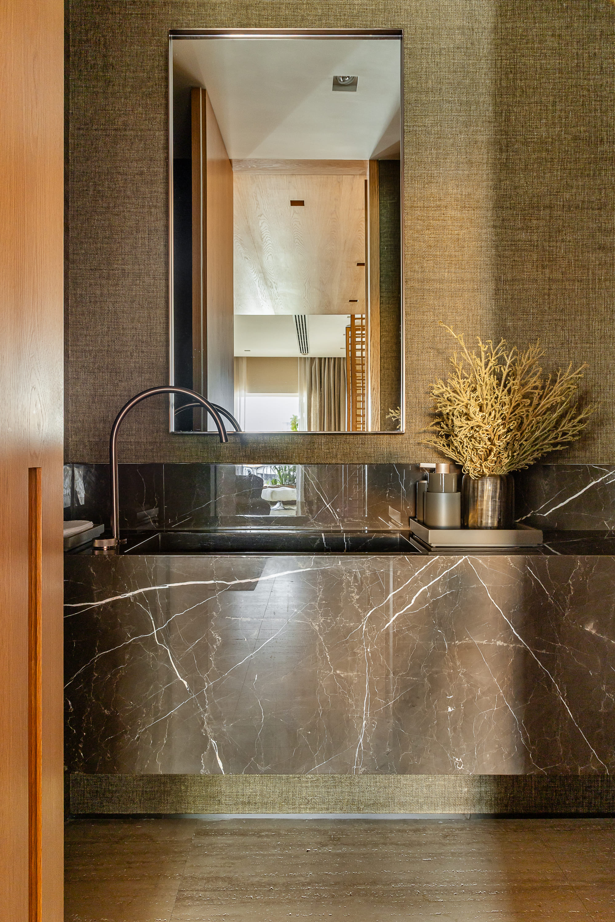 Łazienki, w dużej mierze zachowane w oryginalnym marmurowym wykończeniu, zostały jedynie delikatnie odświeżone. Szczególną uwagę przyciąga toaleta dla gości, w której zielona tapeta, brązowiona armatura i umywalka z marmuru Bronze Armani tworzą elegancki dialog z drewnem.