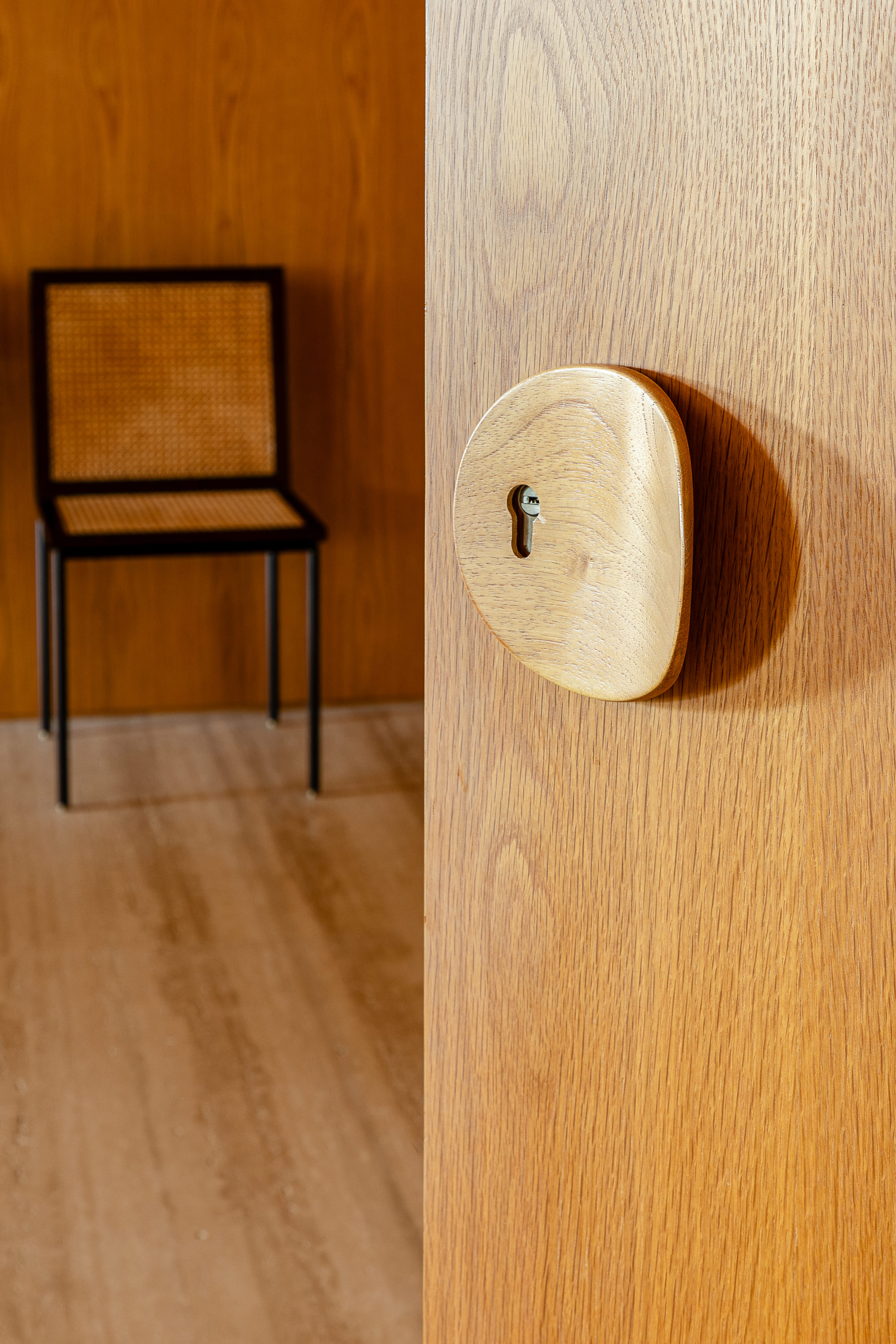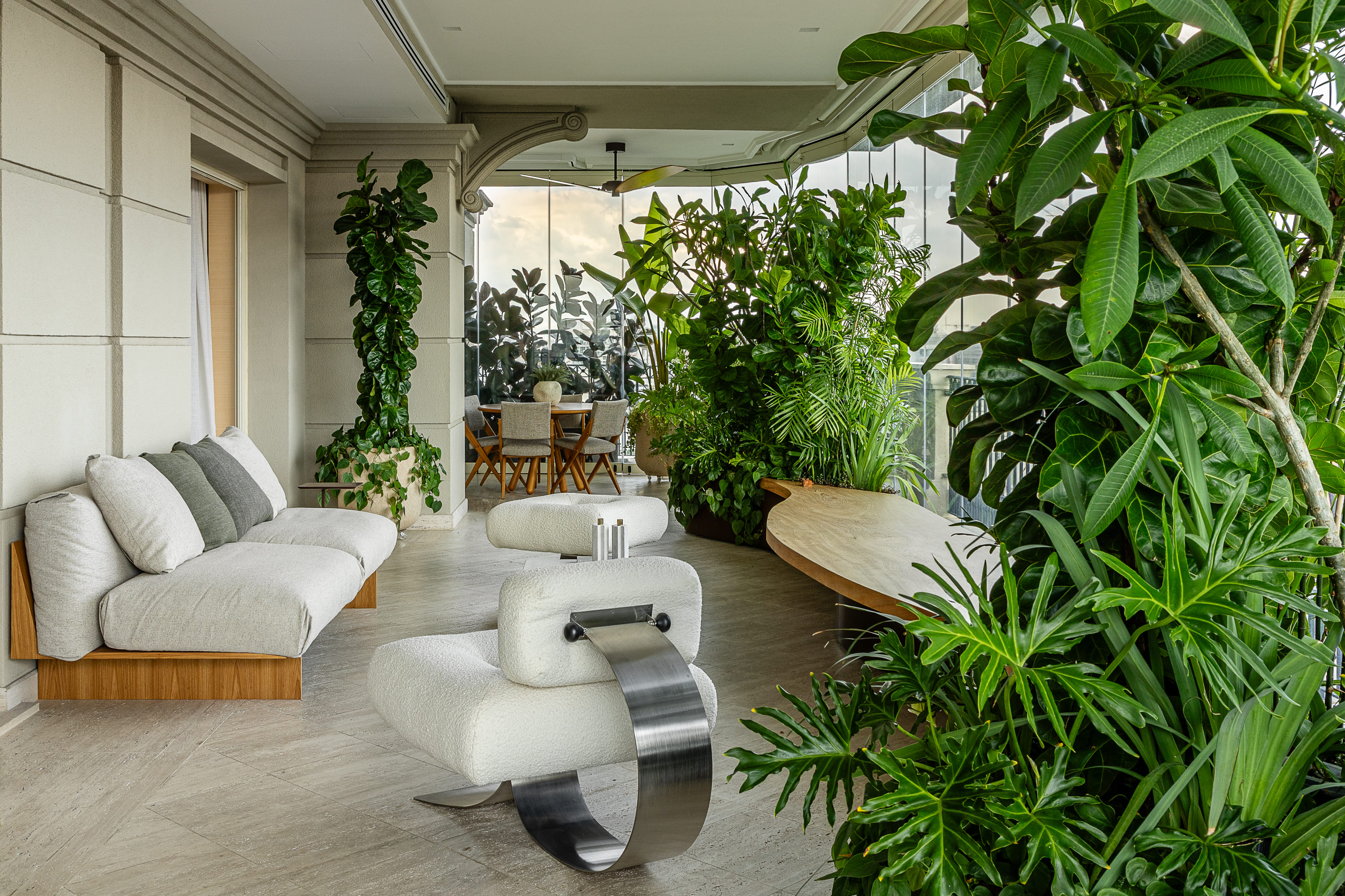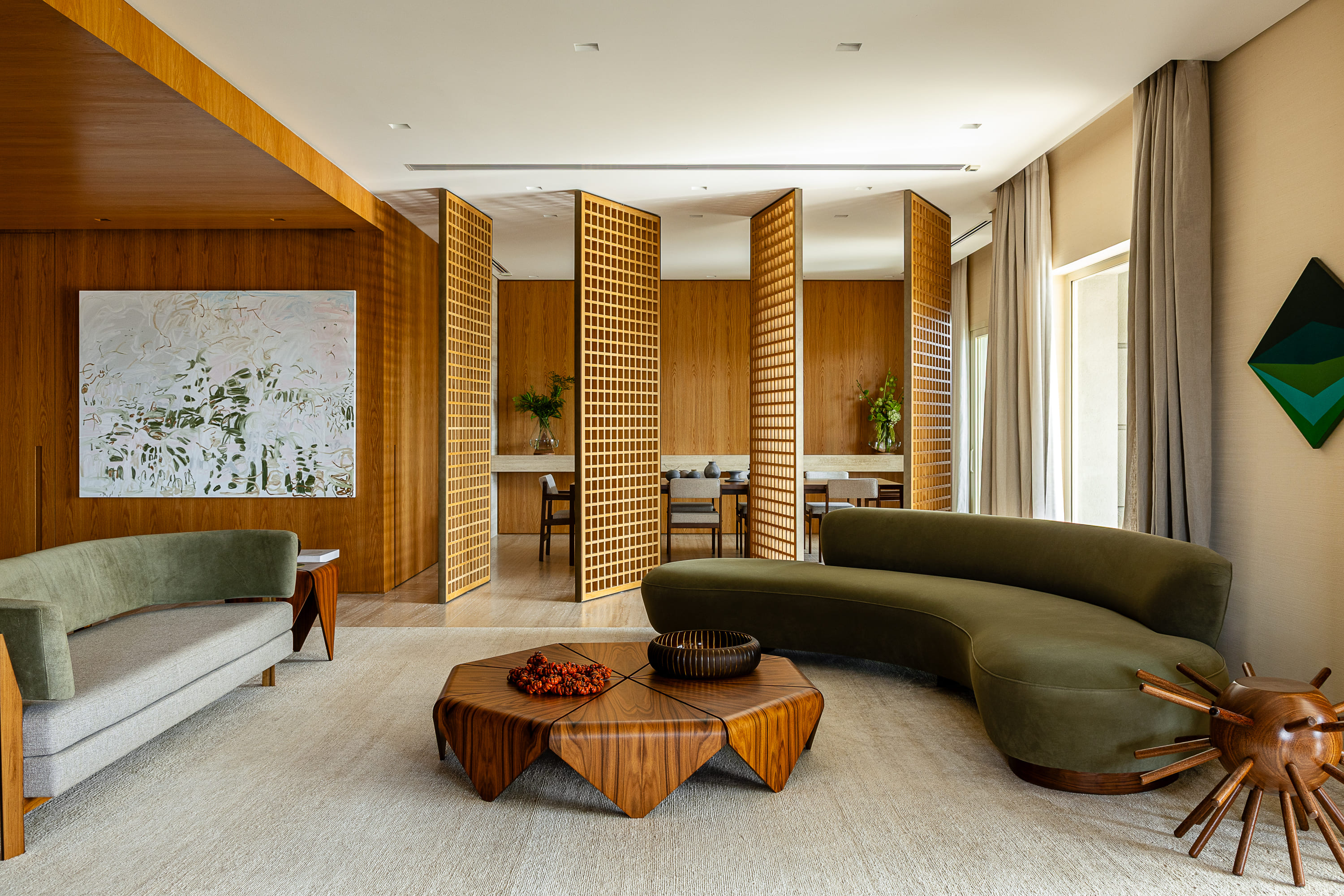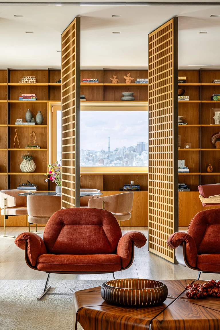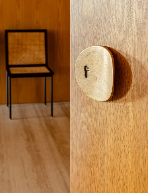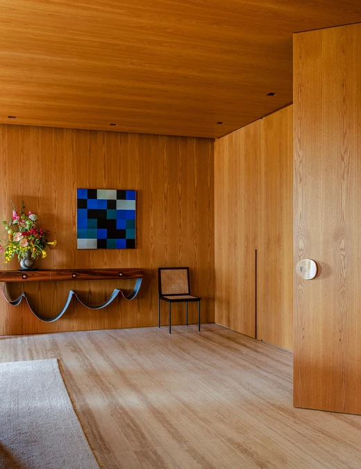 W centrum znajduje się pięciometrowa ława z litego drewna, wsparta na solidnym pniu, która łączy funkcję siedziska i półki, tworząc poczucie płynności i organicznego porządku. Uwagę przyciąga również fotel projektu Oscara Niemeyera, łagodnie kontrastujący z geometrycznym porządkiem wnętrza.