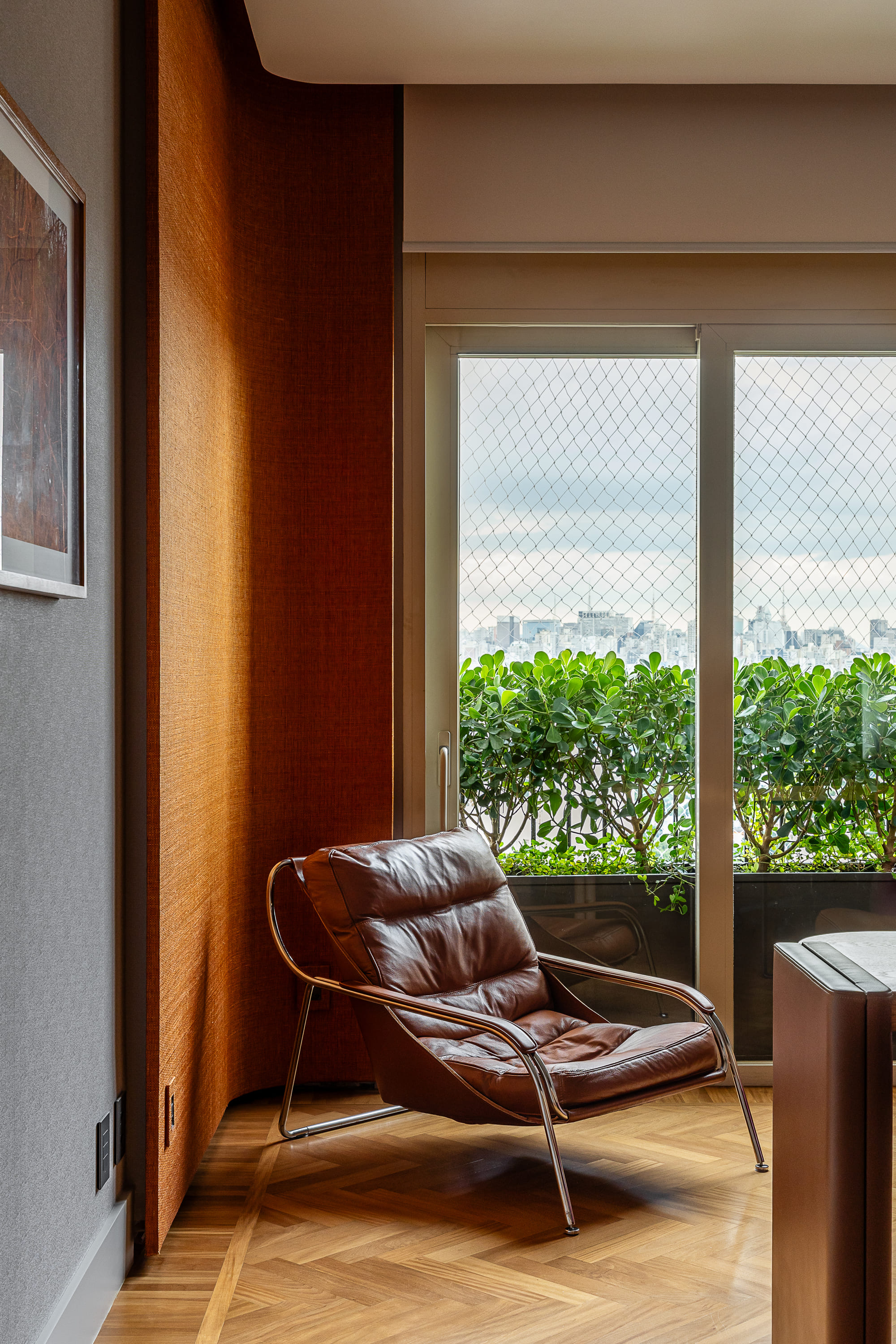 Balkon, skierowany ku zachodowi, stał się symbolicznym przedłużeniem wnętrza – miejscem odpoczynku i obserwacji. Złagodzenie południowego słońca i zapewnienie prywatności w tej przestrzeni stało się możliwe dzięki zaprojektowanej przez Studio MEMM konstrukcji w odcieniu miedzi, którą wypełniła bujna zieleń dobrana przez Bii Abreu.