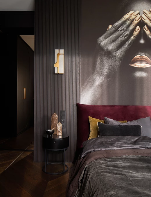 W ogólnym obrazie mieszkania dostrzegamy przede wszystkim wyraziste posunięcia. Takie jak zwłaszcza wielkoformatowa fotografia na głównej ścianie sypialni. Wypatrzyła ją sama inwestorka, w której stylizowany portret budzi skojarzenia z tajemniczą kobiecą siłą i intuicją. Do mocnych akcentów należy też intensywnie bordowe łóżko, wybijające się na tle spokojniejszych barw.