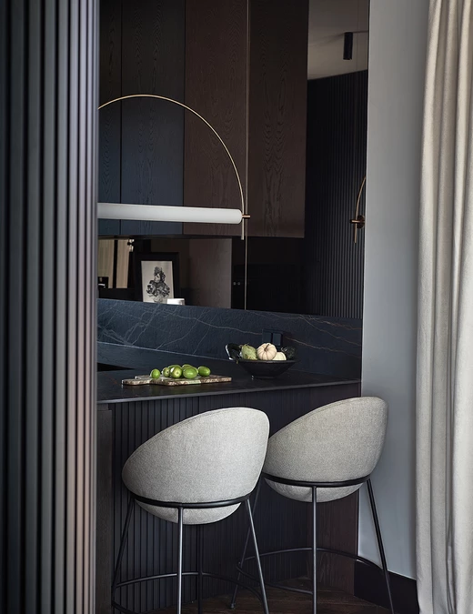 A w pozostałych częściach apartamentu? Dość wspomnieć lustrzane wykończenia w kuchni – nad szafkami oraz w partii cokołu (dzięki temu szafki zdają się unosić w powietrzu). O projekcie dopracowanym w każdym szczególe mówią biżuteryjne włączniki światła i gniazdka marki Gira, kinkiety z kamienia oraz mosiądzu w sypialni, jak również dekoracyjne uchwyty meblowe. Z kolei o codziennej wygodzie na najwyższym poziomie decydują rozwiązania takie jak zaawansowane systemy przechowywania wewnątrz szaf wykonanych przez Deer Wood.