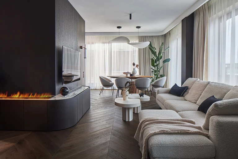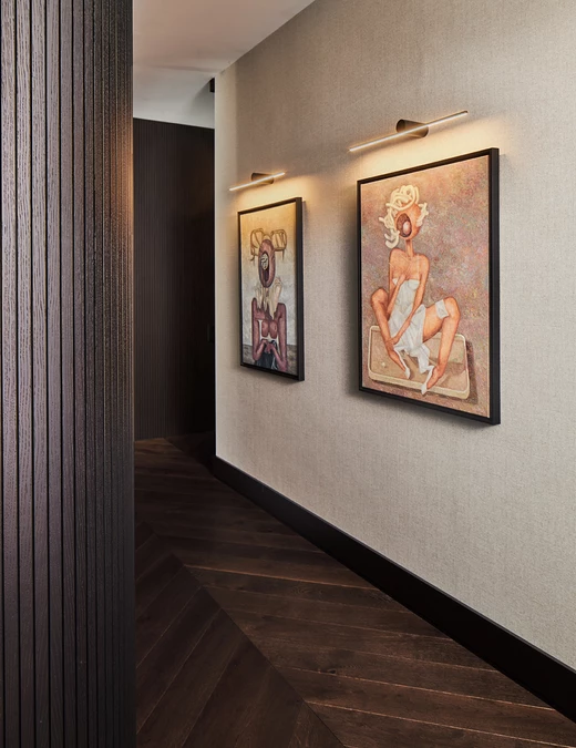 Co ważne, ciemne barwy pojawiają się w postaci naturalnego drewna, kamienia, spieku kwarcowego, dymionego szkła oraz innych szlachetnych materiałów w ten czy inny sposób pozyskanych z natury. To jeden z sekretów przytulnej atmosfery wnętrz. Wyrafinowaną paletę kolorów ożywiają kontrasty – akcenty złamanej bieli w postaci mebli wypoczynkowych i dużych płaszczyzn sufitu, jasnych płytek w łazience, a w holu także tapety z lnu – tła dla obrazów polskiego artysty Filipa Gruszczyńskiego.