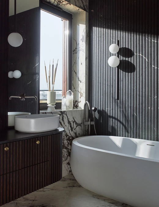 W łazience podobną siłę wyrazu ma owalna wolnostojąca wanna, umieszczona na tle wzorzystego marmuru wzbogaconego o rytmiczne frezowanie. Tu dotykamy znaczenia detalu, niezbędnego w każdym wnętrzu autentycznie luksusowym. Wielką ozdobę aranżacji stanowią m.in. designerskie baterie łazienkowe AXOR - w całej łazience zastosowano kolekcję AXOR One, przy umywalce, prysznicu oraz wannie. Zamontowane na lustrze natynkowe baterie wyglądają jakby unosiły się w powietrzu.
