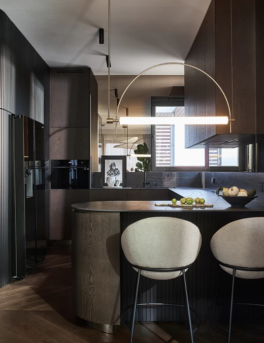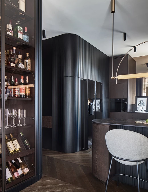 Niezwykle eleganckie wnętrza utrzymane w ciemnych barwach na pierwszy rzut oka budzą respekt, jednak przy bliższym poznaniu okazują się wyrafinowane i zarazem pełne ciepła. Dokładnie tak jak właścicielka tego apartamentu, skrojonego precyzyjnie na miarę jej osobowości. Indywidualny projekt – następnie kompleksowo zrealizowany wraz z wykończeniem i nadzorem – przygotowała Julita Bojańczyk z pracowni architektury wnętrz Deer Design. Niemałą rolę odegrała też Anita Szymańska, projektantka z pracowni stolarskiej Deer Wood.