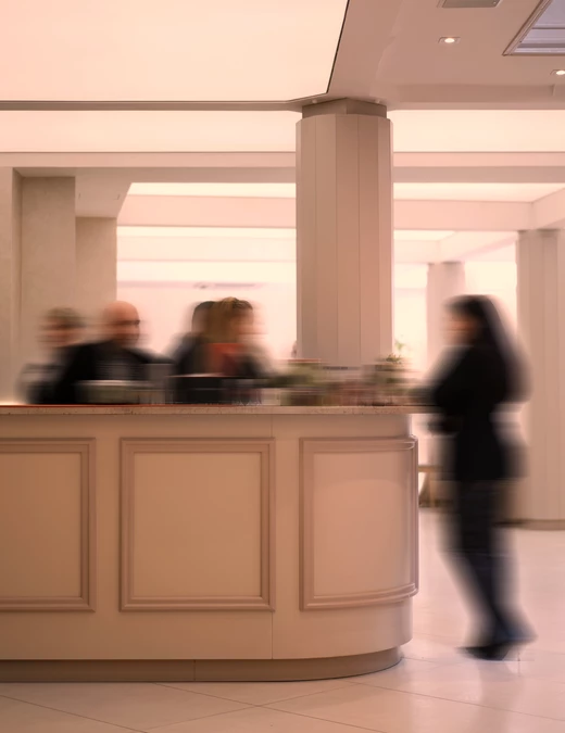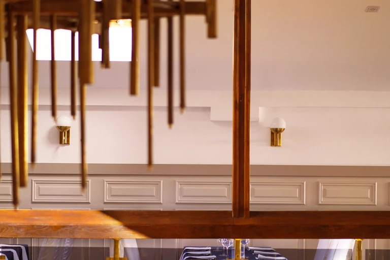 Salę na parterze powiększono w trakcie przebudowy. Ściany zostały obłożone płytą w kolorze taupe zwieńczoną paskiem LED oraz tapetą z pracującą ze światłem przecierką. Słupy konstrukcyjne otrzymały nowy kształt, który ułatwił wkomponowanie jednego z nich w bar.