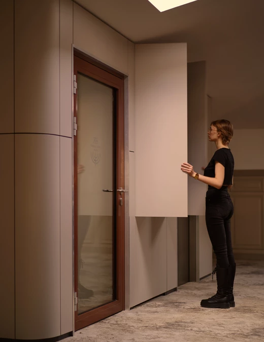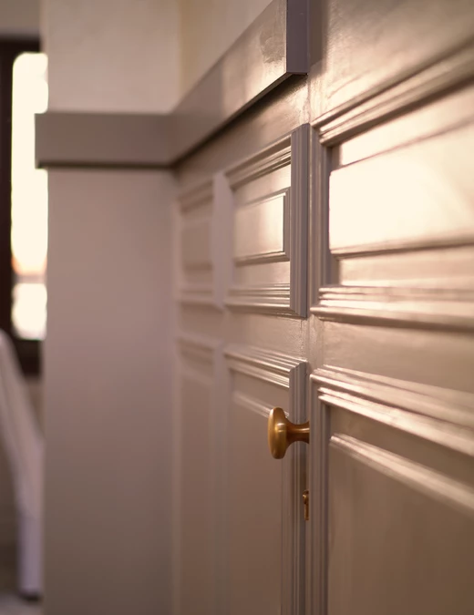 „Chcieliśmy osiągnąć klasyczne i eleganckie wnętrze. Z tego względu na 1. piętrze znalazły się sztukateria, mosiężne kinkiety w kształcie kuli oraz wykładzina imitująca przetarty, stary tynk” – opisuje projekt architektka.