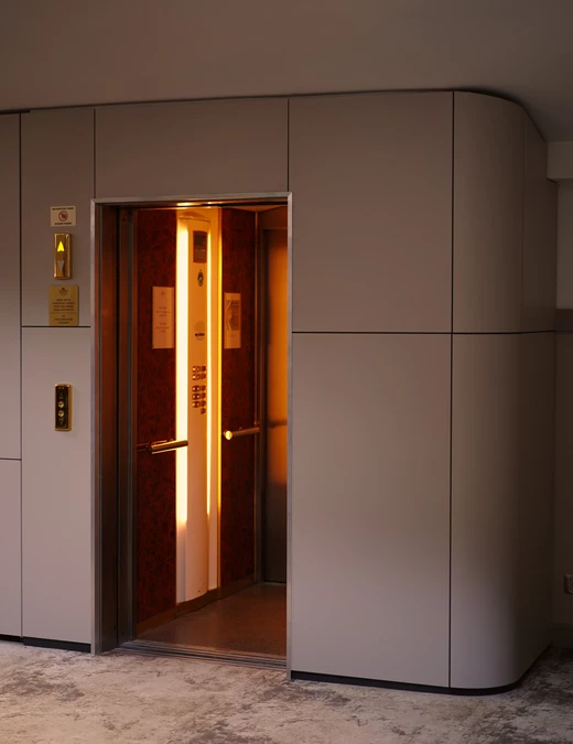 Elementem jednoczącym główne szlaki komunikacyjne jest obudowa windy, drzwi oraz pomocnika kelnerskiego w zaoblonej formie. Wykorzystana kolorystyka pozwoliła na wyeksponowanie drewnianych słupów konstrukcyjnych okalających przebicie w stropie, łączących antresolę z salą. Na tym samym poziomie znajduje się również toaleta, w której królują granatowe płytki.
