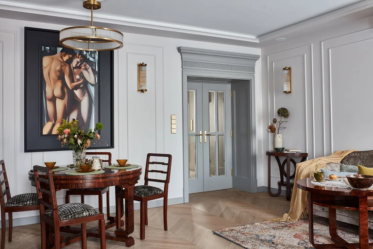 W tym miejscu warto zaznaczyć, że w osobie inwestorki projektant znalazł znakomitą partnerkę w działaniach. To bardzo świadoma estetycznie miłośniczka kultury i sztuki. Razem uzupełniali wystrój mieszkania obrazami z epoki, przede wszystkim pracami Jana Tarasina oraz Leszka Nowosielskiego (w sypialni). To krok naprzód w dziejach estetyki. W nawiązaniu do mebli art déco natomiast inwestorka umieściła obok stołu w salonie serigrafię podwójnego aktu Tamary Łempickiej. Echa realizmu z połowy XX wieku zaznaczyły się ponadto w zupełnie współczesnej wielopostaciowej kompozycji Juliusza Martwego (obok portfenetru).