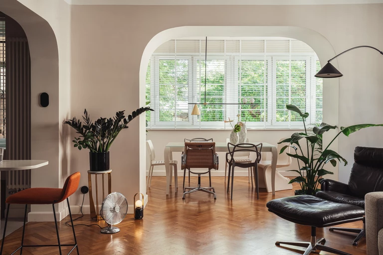 To mieszkanie w łódzkiej modernistycznej kamienicy, zaprojektowane przez Hannę Pietras i Annę Petrovą, stanowi przykład subtelnego połączenia współczesnych rozwiązań z duchem historycznej architektury. Jego wnętrze o powierzchni 140 m² wyróżnia się zastosowaniem naturalnych materiałów, takich jak drewno i kamień. Zabytkowy charakter mieszkania podkreślają odrestaurowane parkiety ułożone w klasyczną jodełkę oraz zachowana i odnowiona stolarka drzwiowa.
