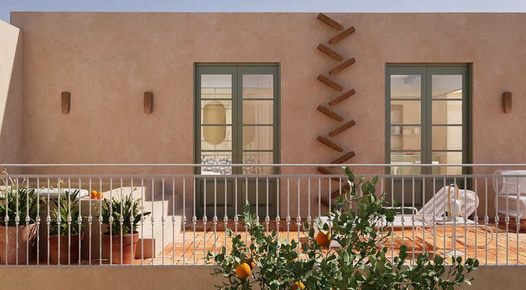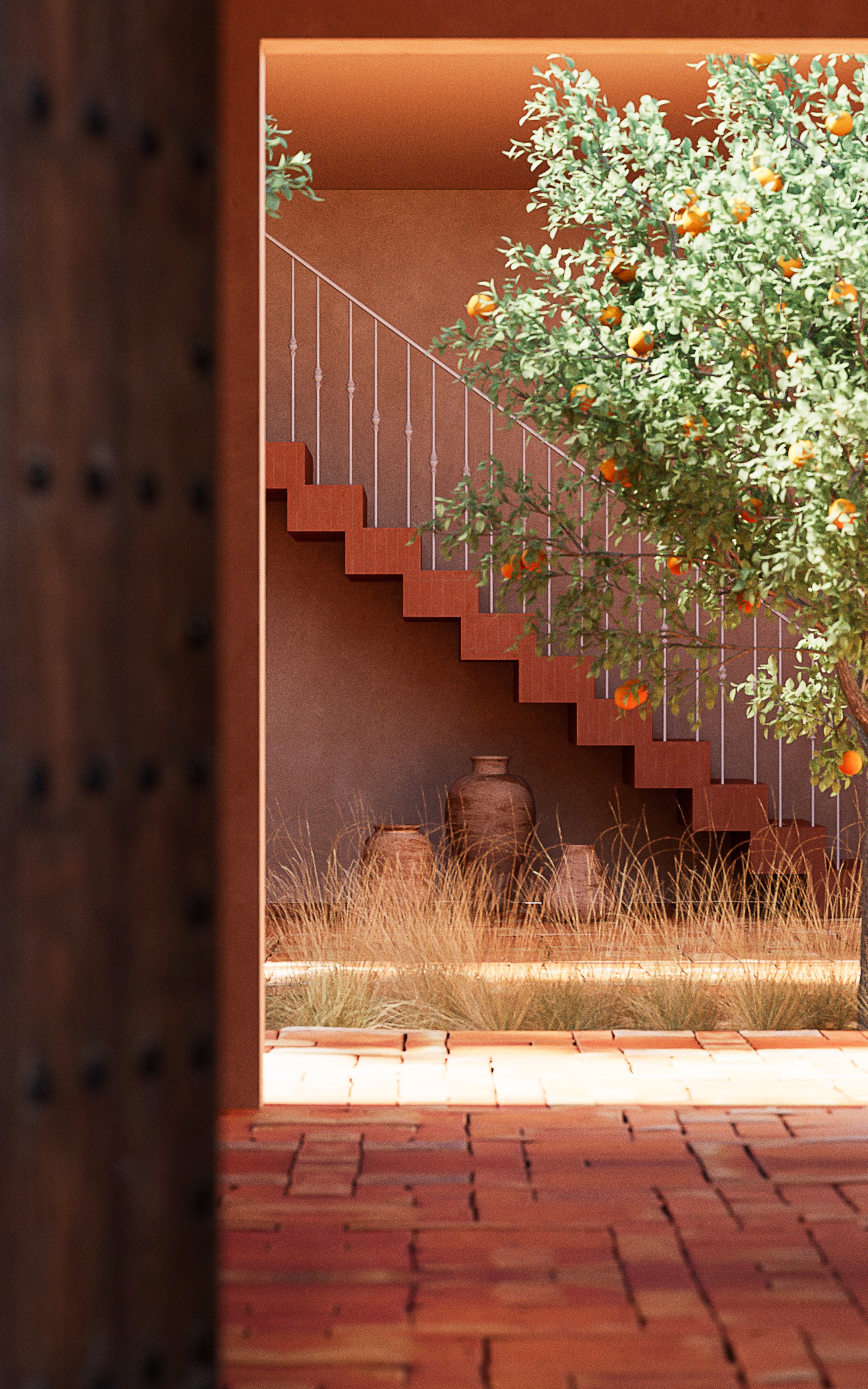 Jasne ściany tworzą ciepłe, teksturowane tło za sprawą ziemistej zaprawy wapiennej, Jest to tradycyjny materiał stosowany tradycyjnie w architekturze andaluzyjskiej, który nawiązuje do starożytnych metod budowlanych tego regionu.