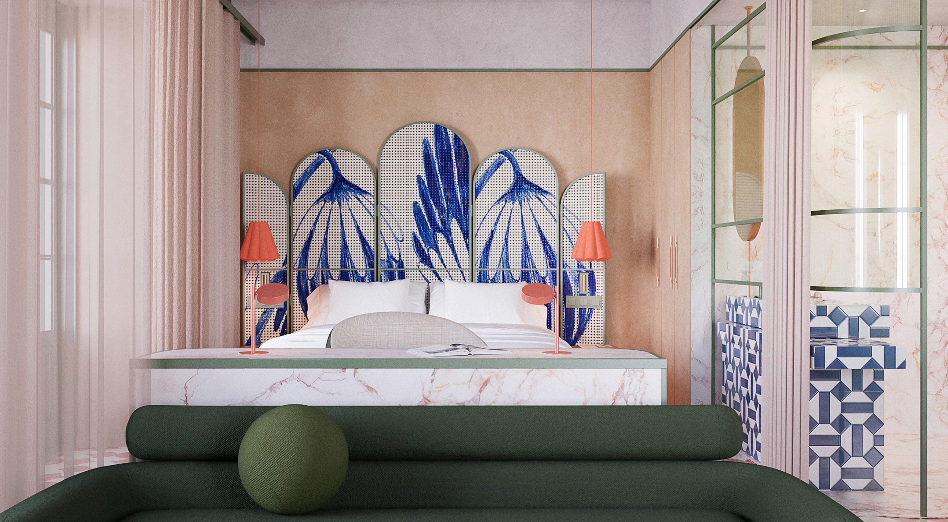 Casa Capirote to wyjątkowy dom w Sewilli zaprojektowany w odcieniach kobaltu, szałwii i koralowego różu przez andaluzyjskie studio  Cateto Cateto. Koncepcja wnętrz jest głęboko zakorzeniona w historii i rzemiośle Sewilli, a jednym z jej najważniejszych przejawów jest wielobarwna ceramika z Triany. Jej ślady znaleźć można w wielu elementach dekoracyjnych Casa Capirote, takich jak kwiatowe wzory nad łóżkiem i w łazience.