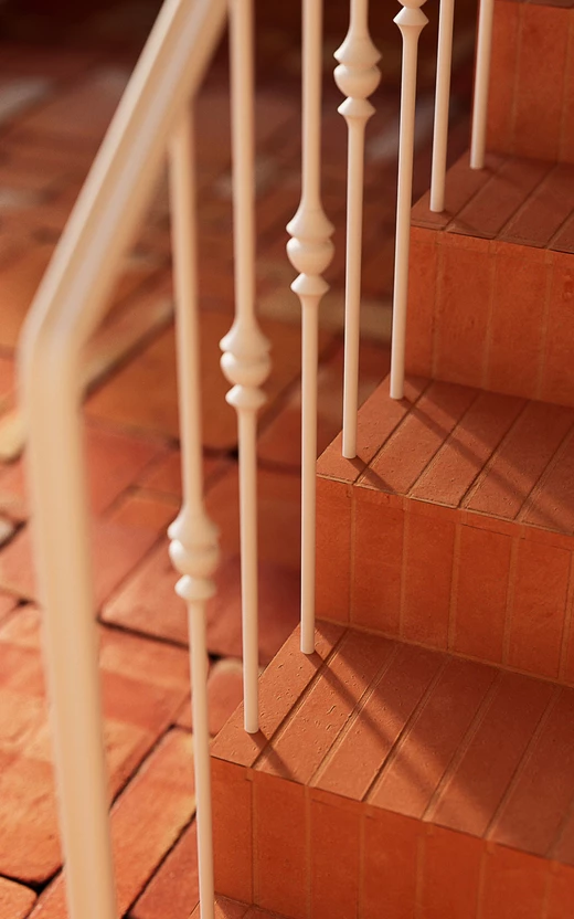 Drewniane schody z fantazyjnie wyprofilowaną białą poręczą dodają Casa Capirote elegancji i wyrafinowania. Światło zdaje się ślizgać po ich powierzchni, jeszcze silniej podkreślając znaczenie rzemiosła i piękno geometrycznych form.