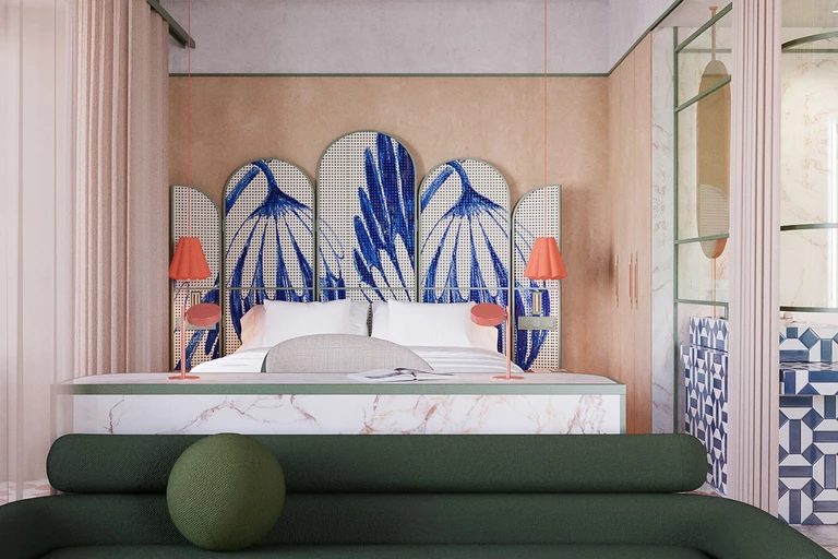 Koralowy odcień różu pojawia się on na podłogach wyłożonych płytkami, rzeźbionym stoliku kawowym, ramie łóżka i abażurach lamp, stojących po obu stronach łóżka. Kolor działa pobudzająco, inspiruje do działania i ułatwia start w nowy dzień.