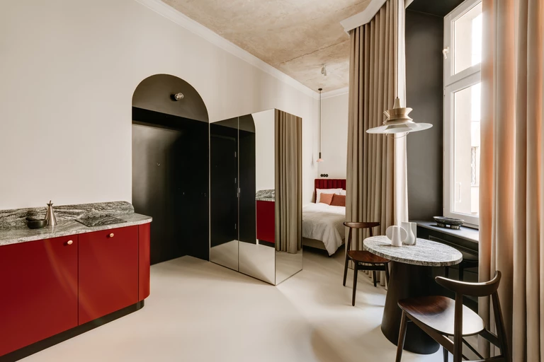 Jak zmieścić wszystkie potrzebne funkcje na 23 metrach kwadratowych? Projektanci z biura Mistovia w projekcie tego krakowskiego mieszkania zlokalizowanego w modernistycznej kamienicy z 1912 roku postawili na kreatywne rozwiązania i minimalistyczne formy, nie rezygnując przy tym z koloru.